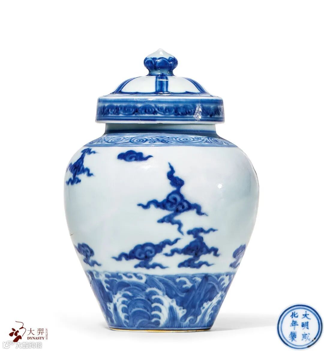 拍品直口短颈,鼓腹下收,承矮圈足,带子母口钮盖,盖面微鼓,造型规整。通体施白釉, 装饰青花纹饰,肩部绘卷草纹一周,腹部绘云纹,以“壬”字云纹为中心,呈“品”字状分布,间以小云若干,显得悠然自若,其下绘海水江崖一周,盖上绘卷草纹一周,其上绘变形莲瓣纹,内大部留白,摘钮上绘花叶,仿若花苞。外底心青花双圈内书“大明成化年制”六字双行楷书款。