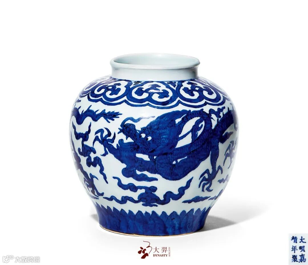 罐唇口,短颈,丰肩圆腹,下渐收,圈足。肩部绘如意云纹,腹部绘穿云行龙,四周装饰“壬”字云纹及火焰纹,近足以莲瓣纹作底边。底足内书“大明嘉靖年制”六字双行楷书款。本品青花发色蓝中发紫,仿若朝珠上的青金石色,为嘉靖特有的“回青”料发色,画工精湛,应为该时期的精工细作。