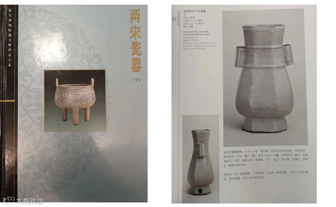 据《清档》记载,雍正帝屡次命郎中海望持内宫所藏宋代瓷器原器交于唐英对照仿制。我们有幸在《故宫藏文物珍品大系·两宋瓷器(下)》中发现,第39号之“宋哥窑贯耳八方扁瓶”即为此雍正八方贯耳瓶的母体。原宋哥八方瓶为“清宫旧藏”,高24厘米;造型、高度与此雍正器庶几相似,惟雍正器为汝釉鱼子纹开片,且器型比宋器略显周正。或为唐英按同一宋代原器施以不同釉色之品。而雍正瓶穿带孔为方,宋代原器为圆孔,想来或以方圆区别时代。
