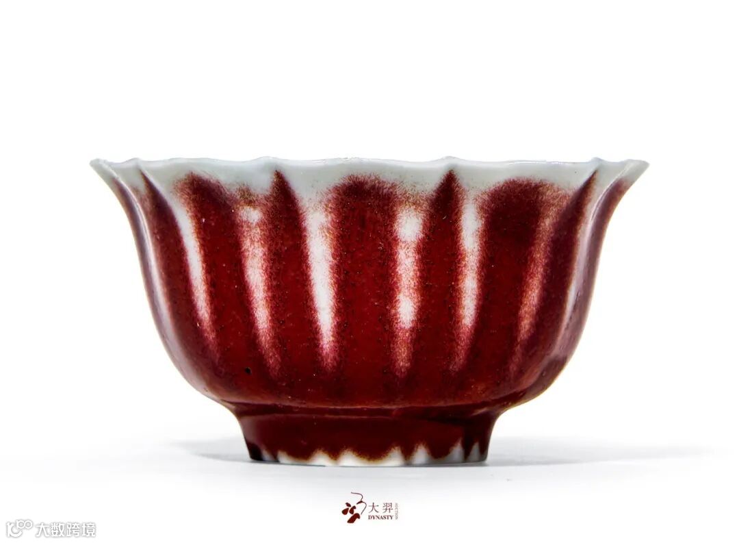本品棱口外撇、弧壁、圈足,通体罩施宝石红釉,色泽娇红欲滴。口沿与凸棱处因高温熔融使铜红釉向下流动而露出白色的胎骨,更显娇艳。高温铜红釉自元代景德镇御窑厂创烧,但因烧造难度极大,历经工匠多番改良色釉、调整烧制条件及窑温,直至永乐时期,铜红釉美器方才始成。《明史·舆服志》载:洪武三年,明廷规定“服色所尚,以赤为宜”,这不仅标志着新王朝对赤色的偏好,更代表着从礼制方面,皇家对这一朱红颜色的专有权。故举凡瓷器,饰以朱红,则必非常物。成书于万曆十七年王世懋所著的《窥天外乘》中称“永乐、宣德间内府烧造,迄今为贵。其时以鬃眼甜白为常,以苏麻离青为饰,以鲜红为宝。”且因其烧造技术极难掌握,故而后世也有“千窑一宝” 之说。