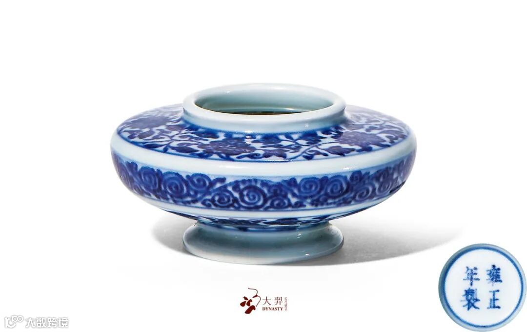本品造型独特,直口,平折肩,浅弧腹,高圈足外撇,设计精巧,盈手可握。通体满施透明釉,器身装饰缠枝花卉纹和卷草纹,纹饰精美,布局巧妙,图案绘画精细入微,青花发色蓝艳纯正,画工流畅,器外底单蓝圈书青花“雍正年制”四字双行楷书款。雍正时期的青花瓷,无论造型和装饰,都可以用一个“秀”字来概括,与康熙青花挺拔、遒劲的风格迥然不同,而是代之以柔媚、俊秀的风格。这件水盂造型精致,秀丽非常,具有典型的雍正青花特点,不失为一件雍正时期文房佳器。