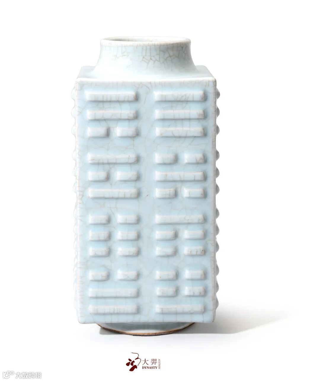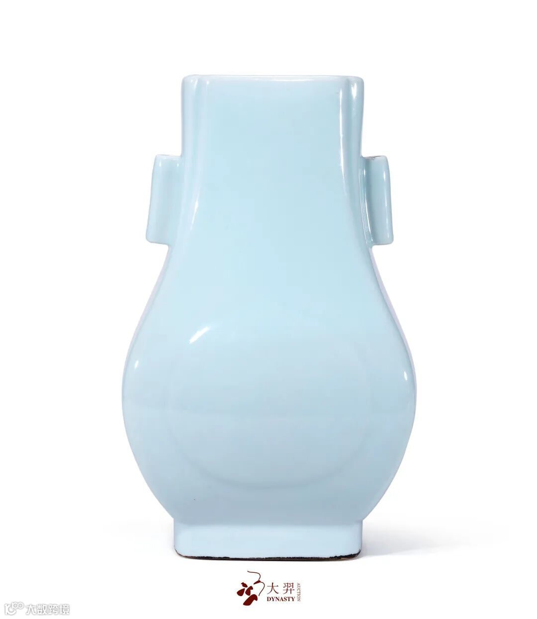 贯耳瓶流行于宋代,其器形仿汉代投壶式样,直颈较长,腹部扁圆,圈足,颈部两侧对称帖竖直的管状贯耳,哥窑、官窑、龙泉窑等多有烧制。清代亦有仿制,乾隆时对原有的贯耳瓶在器形及装饰上进行改造,称为“四方杏元双管瓶”,其造型深受乾隆皇帝喜爱,景德镇御窑厂曾烧造了多种色釉的贯耳瓶,以供乾隆帝赏玩。此类器形后成官窑经典,历朝均有烧造。光绪朝时,四方杏元双管瓶较常见的釉色有窑变釉、仿哥釉、仿官釉、厂官釉、霁蓝釉、粉青釉等,其中仅前两者为大运琢器固定品种,粉青釉作品则传世量较少。瓶口倭角近似海棠形,直颈两侧饰双贯耳,长方扁腹至下外鼓,腹部扁圆,两面饰凸起的杏形开光,长方形圈足,足内书“大清光绪年製”六字双行楷书款。