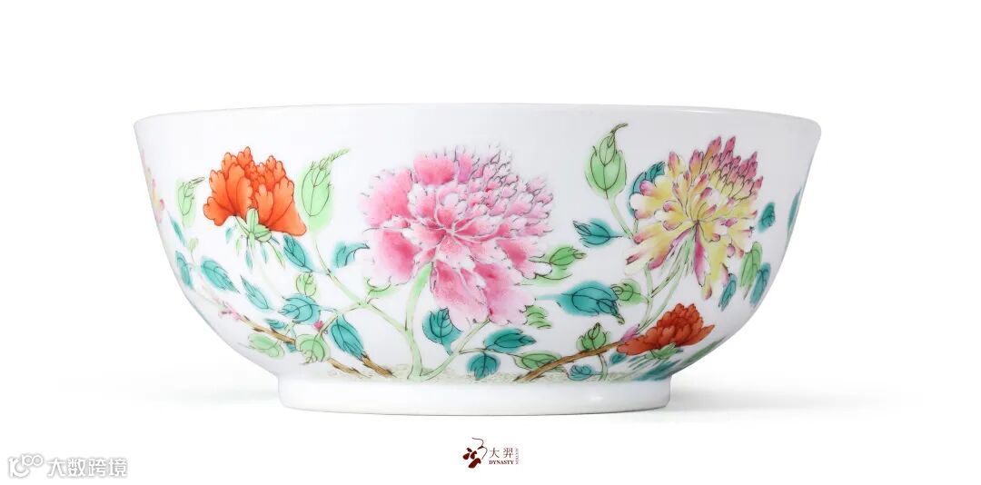 其碗敞口,深腹圆收,下承圈足,造型端庄稳重,比例协调。裹足刮釉,圈足露胎处可见胎色洁白,胎质细腻滋润。通体罩施白釉,釉面光亮匀净。外壁粉彩绘牡丹纹、石榴纹,红花绿叶,尤以粉白、黄粉、矾红三色花对比鲜明,极为清雅。空白处矾红绘蝙蝠口衔串挂铜钱的锦带,寓意福到眼前。