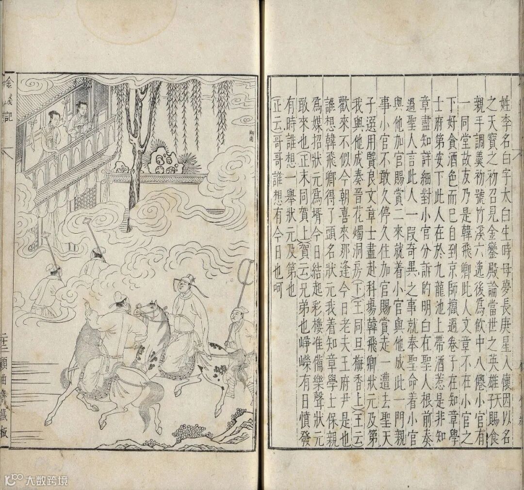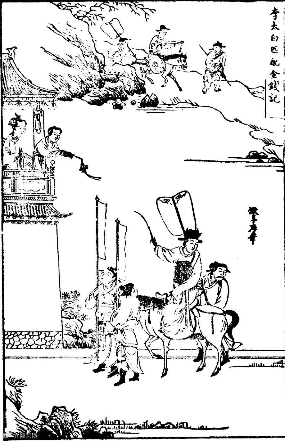 本品与下图顾曲斋《古杂剧》刻本中《金钱记》第四回场景较为相似,描绘韩翃高中状元后,与贺知章骑马从王家彩楼下经过,柳眉儿的绣球落在身边,韩翃却因前耻,故意不接。