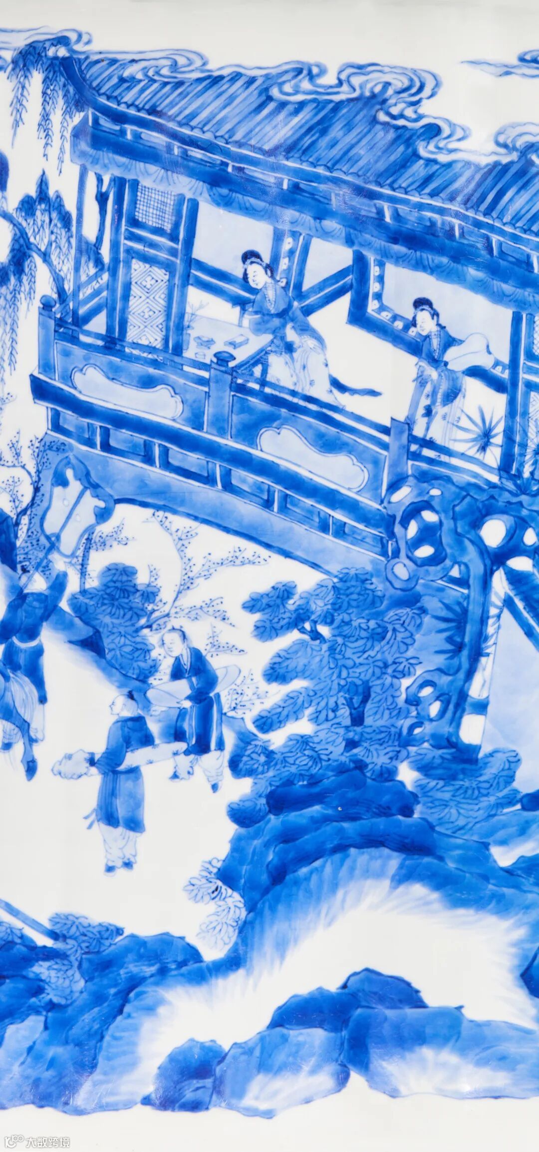 其纹饰绘笔娴熟舒畅,青花发色翠蓝,器身以青花满绘《金钱记》故事图,彩楼上柳眉儿手持绣球,扶案凭栏而坐,望眼欲穿,韩翃与贺知章骑马从楼下经过,仆从相随,意气风发。线条纤细流畅,构图紧凑有致,青花发色浓淡相宜,山石树木笔法苍润,人物景致栩栩如生,笔触生动。清代康熙时期制瓷工匠把他们从诗中展现在观音瓶之上,构成了一幅栩栩如生的故事图。