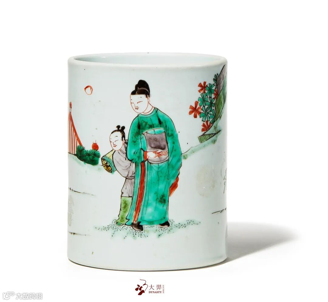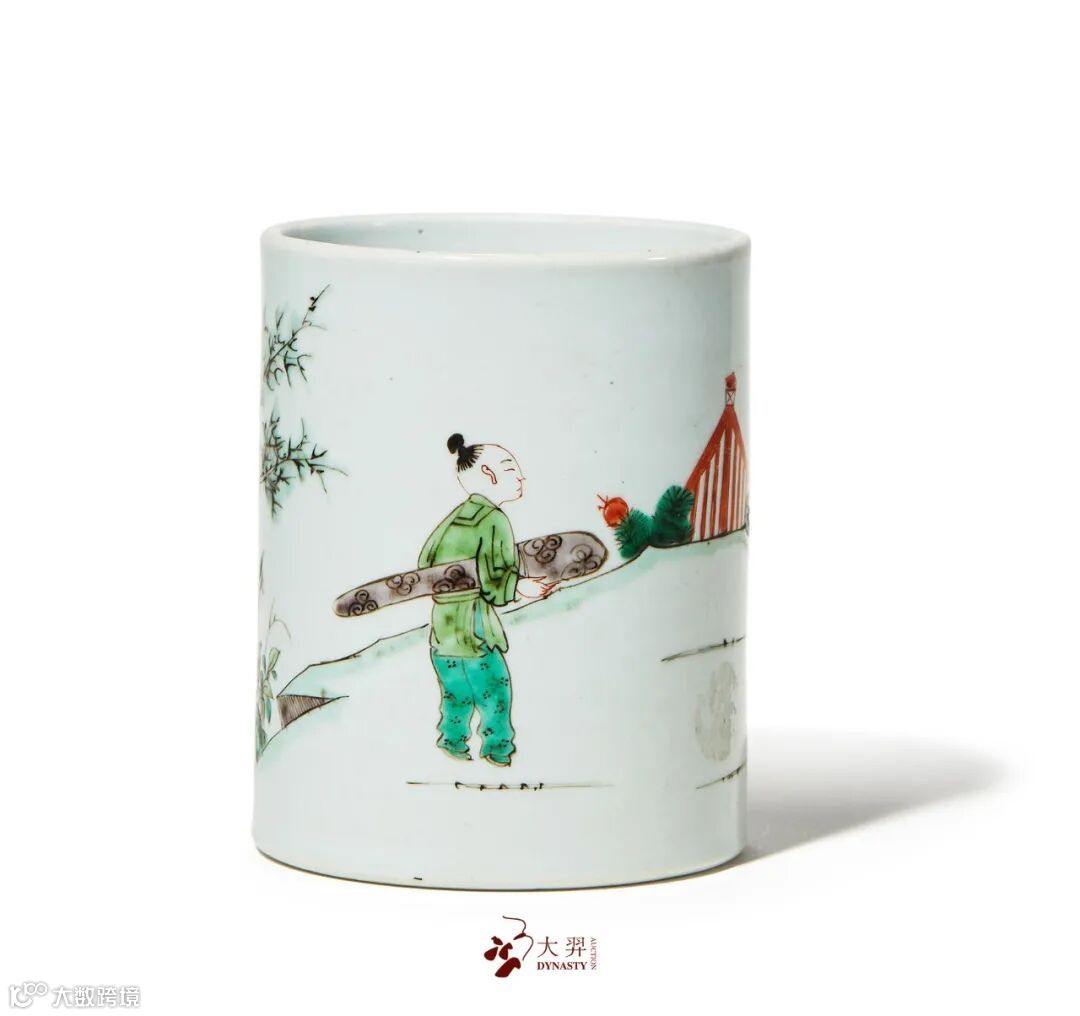 笔筒形制规整,胎质缜密,白釉滋润,玉壁底。外壁绘五彩人物故事图,人物构图顶天立地,服饰色彩丰富,绘画工艺精湛,是康熙一朝五彩人物笔筒中的精品。