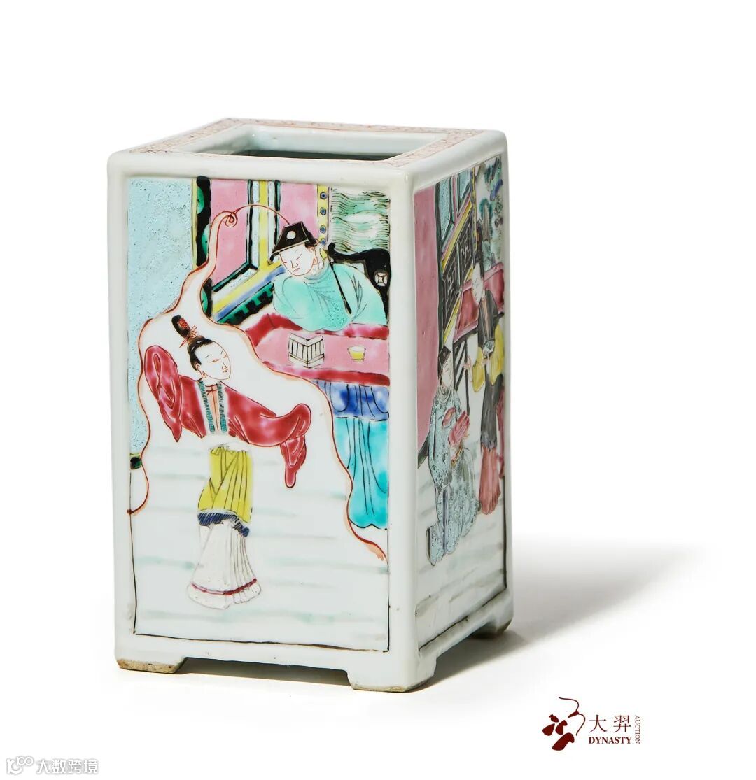 拍品作四方形制,规整雅致。通体满施白釉,笔筒四面开光内绘西厢记人物故事图,人物形象生动,用色淡雅有致,为案头佳品。