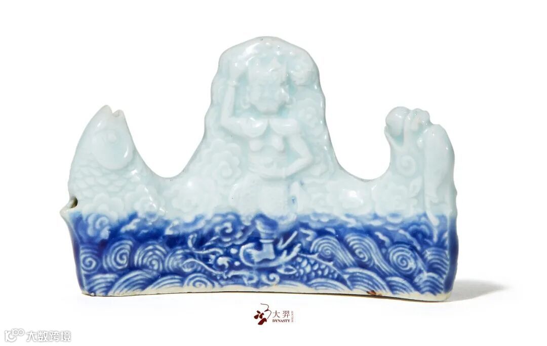 笔山由左及右分别堆塑鲤鱼、魁星、游龙,周边装饰花卉数朵,散落于海水之上,有“落花流水”之意。左侧鲤鱼身形矫健,鱼嘴及背脊处各留一小孔,做砚滴用;中间双面贴塑魁星,脚踏威龙立于海浪之上,寓意“独占鳌头”;右侧游龙,口衔龙珠,威猛异常。拍品结合笔山环形造型,成围拱之势,构思巧妙,神态逼真。上部施白釉,釉色白中泛青,其下青花平涂海浪纹,自由肆意,青花发色浓艳深沉。