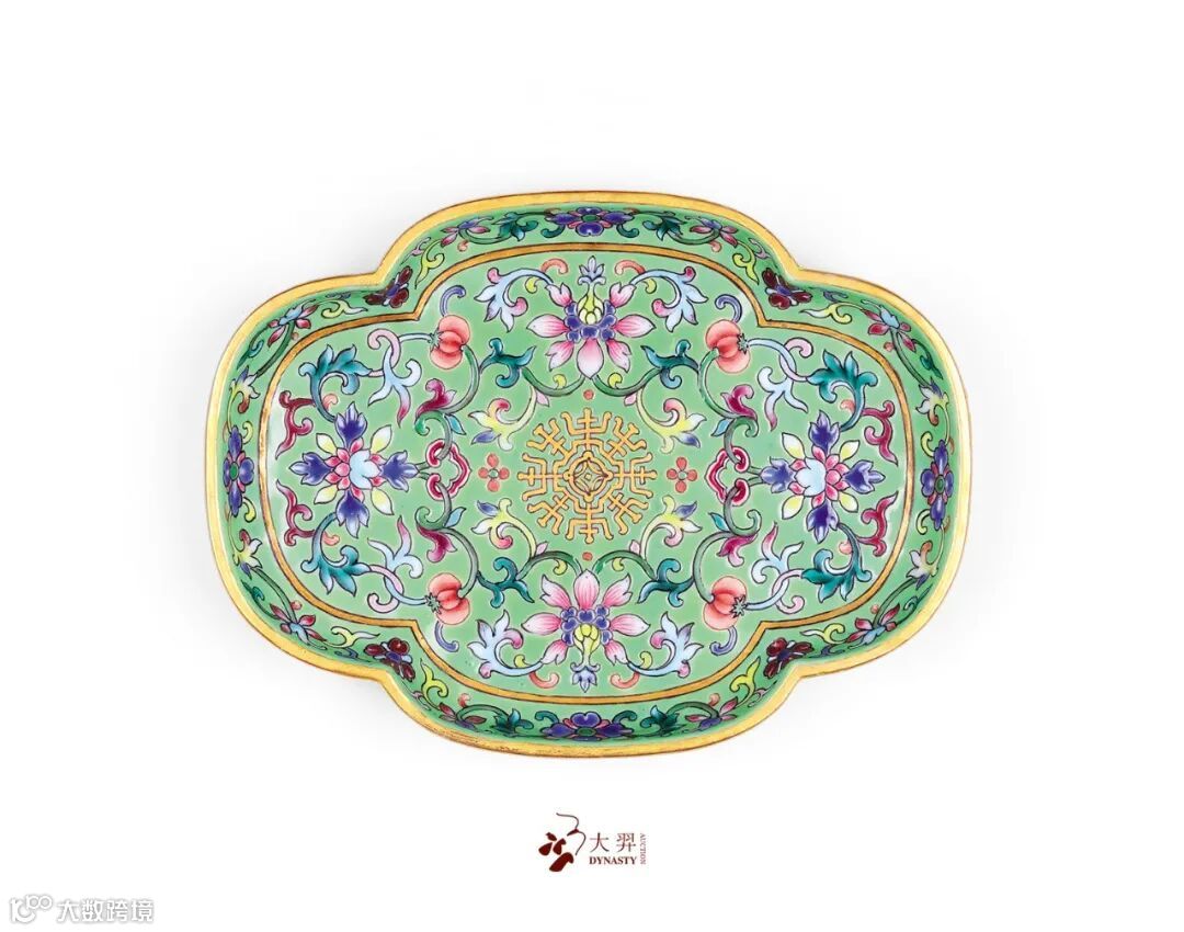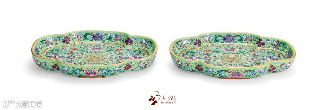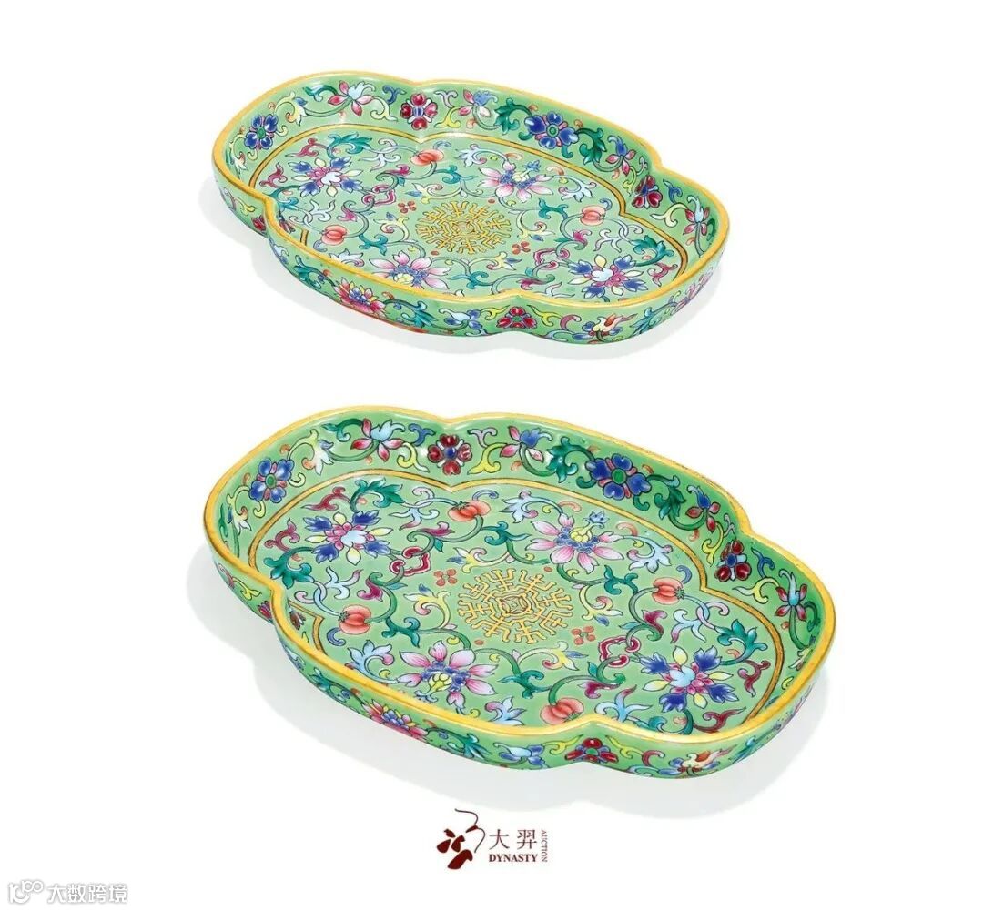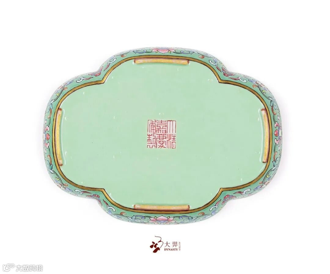 拍品成对保存,式样、纹饰一致,当为同一窑烧制,难能可贵。此盘作海棠花口,浅腹平底,底部边沿随器形的曲折附对称四足。器形规整,器身皆施绿釉,并加绘缠枝西番莲纹样,口沿施金。拍品彩绘严谨,延续了乾隆御窑精工细作之水准,可谓嘉庆粉彩器之佳作,亦是嘉庆御窑特有之茶具精品。存世嘉庆海棠洗大多带御题诗文,如本件拍品全身绘缠枝西蕃莲纹者则极为少见,又兼成对保存,更堪珍藏。