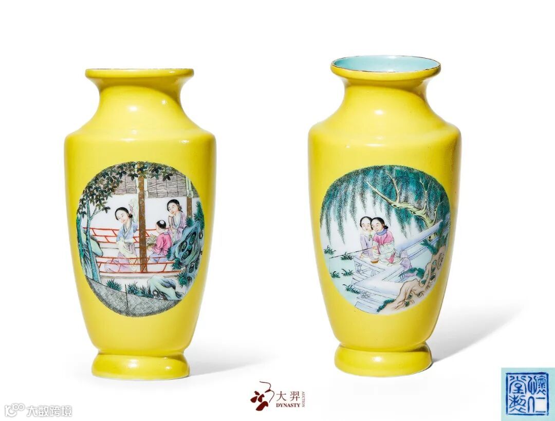 黄地开光粉彩仕女图瓶