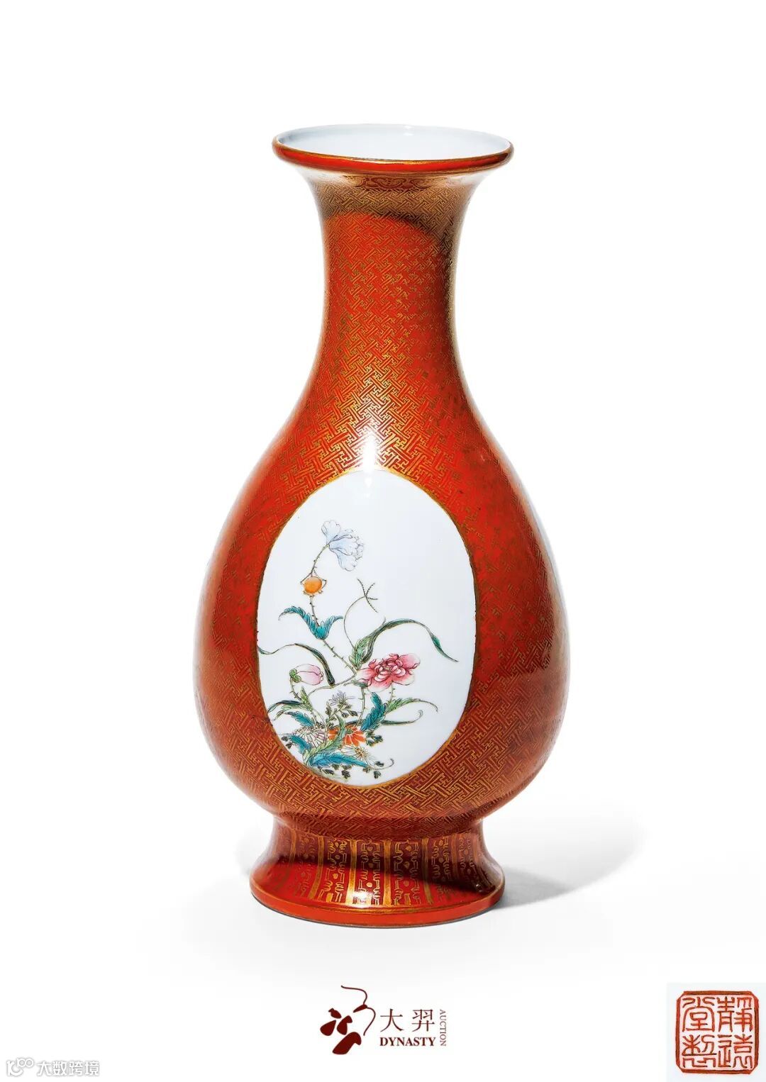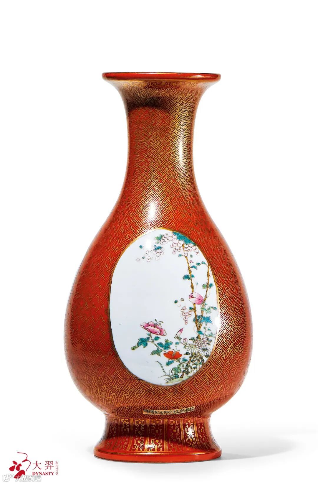 总统徐世昌定制珊瑚红釉描金开光粉彩花鸟纹瓶