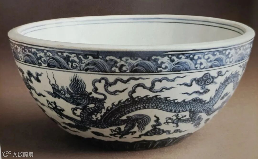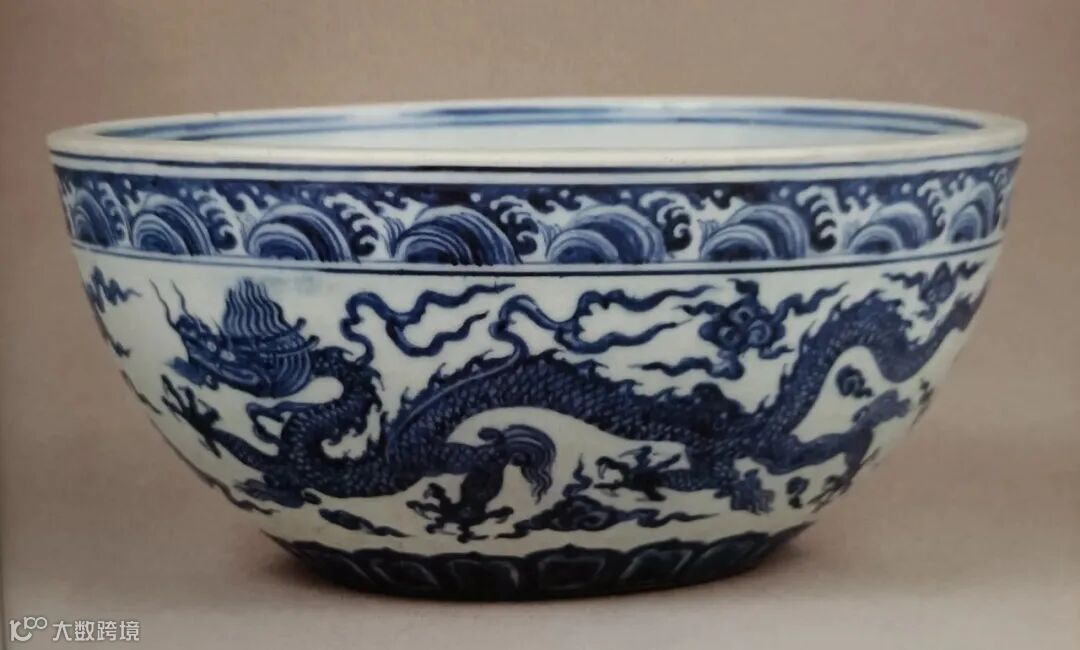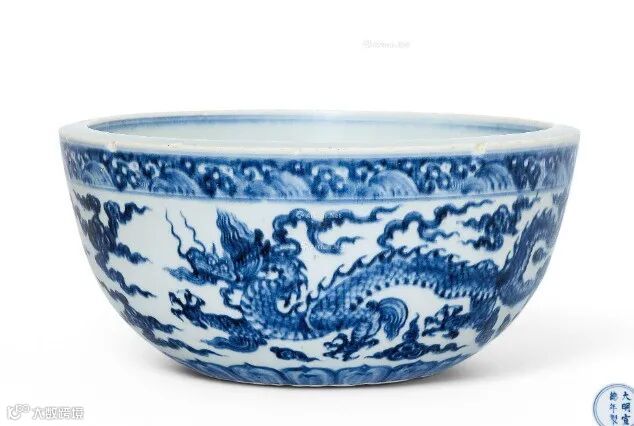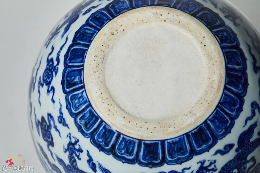 口沿绘海水江牙一周,翻卷的浪花,奔涌的海水,气势非凡;钵内施细腻白釉。青花发色浓艳深沉,所绘云龙生动绘画技法娴熟,青花线条凹陷深入胎骨,青花自然晕散,多处现铁锈斑,施护底胎釉,胎质滋润坚实。龙身须发飘扬,四肢伸张,呼之欲出,笔法遒劲有力,气势威猛刚劲,远为后朝所不及。