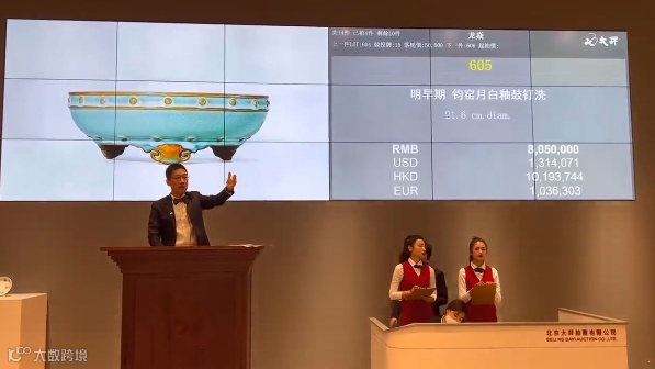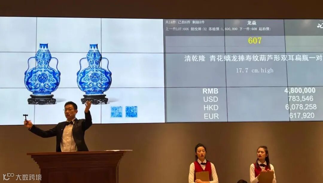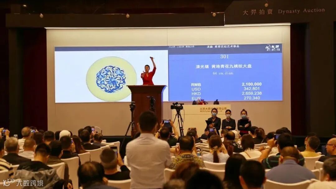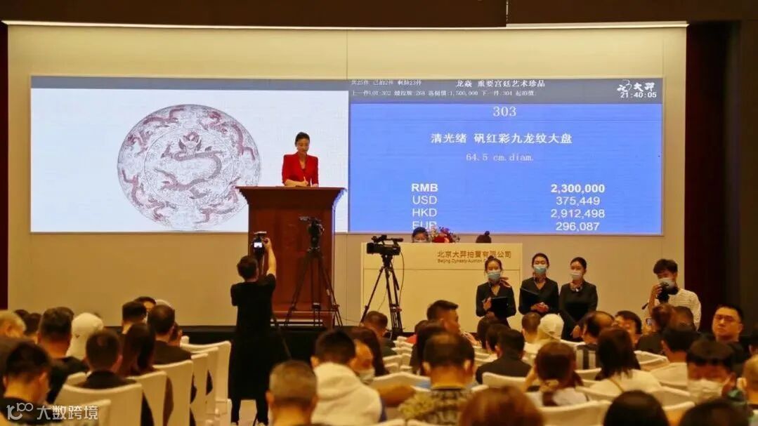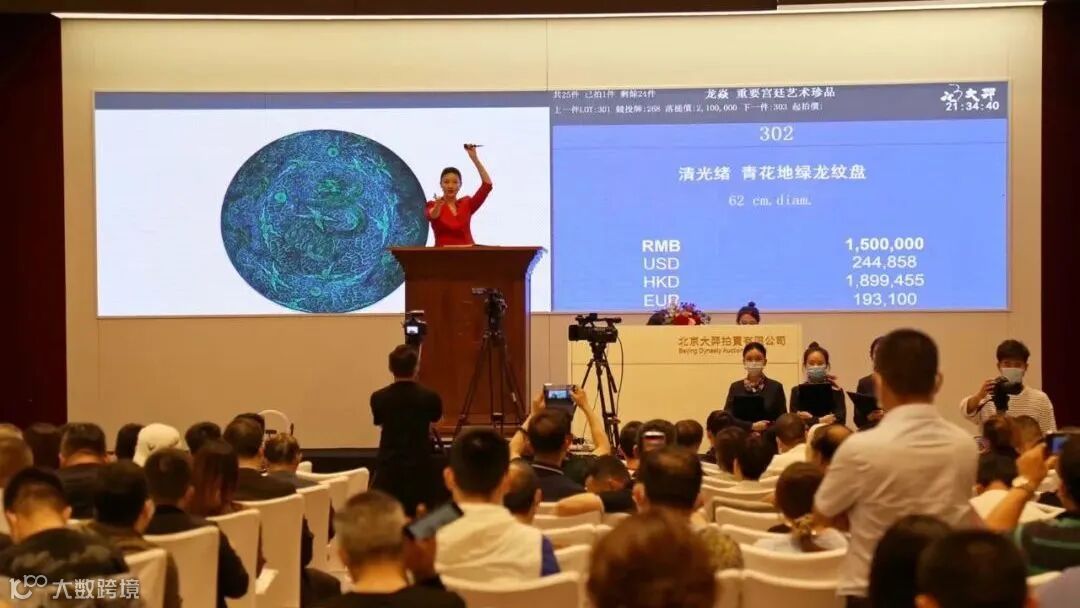 2021年春拍中,备受瞩目的经典巨制-清乾隆 御制青花釉里红海水云龙纹抱月瓶以及永窑珍品-明永乐 青花飞鸣宿食图大罐等重器皆顺利交割,同时也刷新了北京大羿拍卖夜场的成交记录。