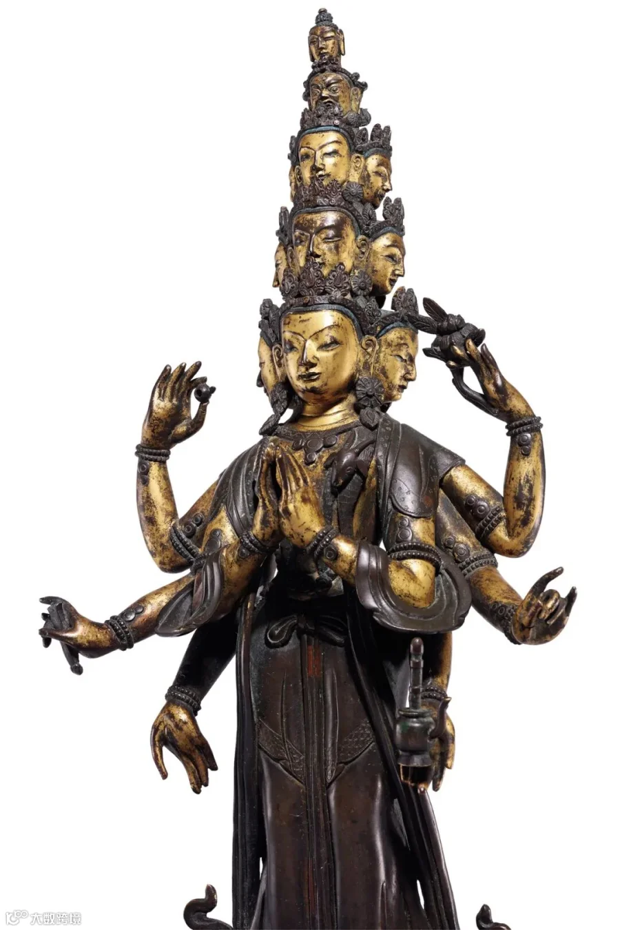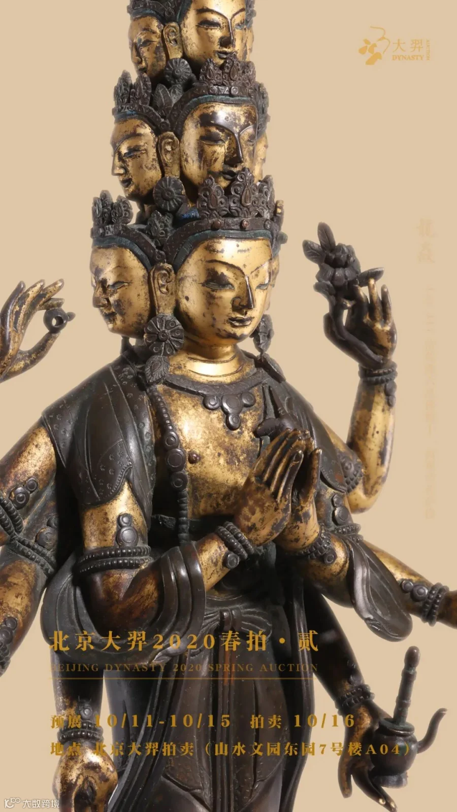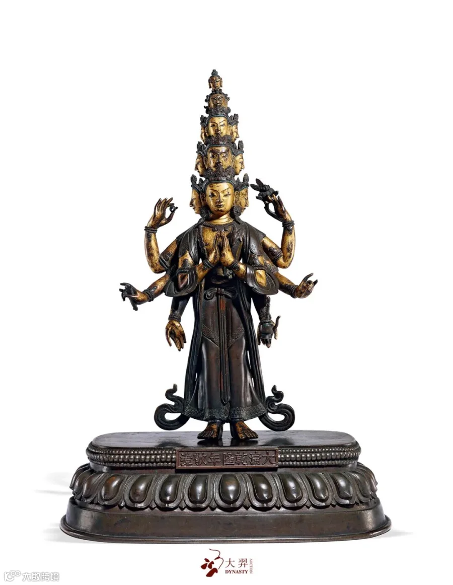 大羿拍卖于金秋重点推出几尊佛像拍品,其中一件清乾隆六品佛楼十一面观音菩萨像颇为引人注目。像身高度为40公分,由黄铜铸造而成,胎体厚重。采用烧古泥金的制作工艺,是清代宫廷”的工艺特点。整像造型规范,工艺精湛,保存完好,为乾隆六品佛楼的主尊造像,极具收藏价值。