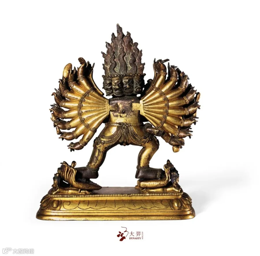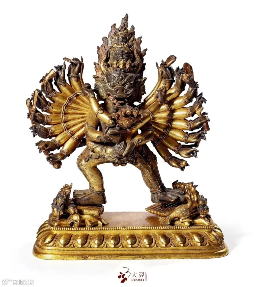 金刚像主尊九头,正面为水牛头,面有三目,象征阎罗王;右三头象征愤怒、权势、安静三德能;左三头表示清净、死亡、愤怒;居中再上一头,呈愤怒像,头戴骷髅冠,为吃人夜叉,名参怖;顶层一头,为其本尊文殊菩萨形象。三十四臂分置于左右两侧,十六足各踏人、兽、禽等,象征十六空。右手持钺刀,左手持嘎巴拉碗,亦为忿怒相。单层莲座上缘连珠纹一周,排列规整,莲瓣扁平挺拔做工精细,全像鎏金灿然,制作精美,为十八世纪清代北京,内蒙藏传佛教造像佳作。