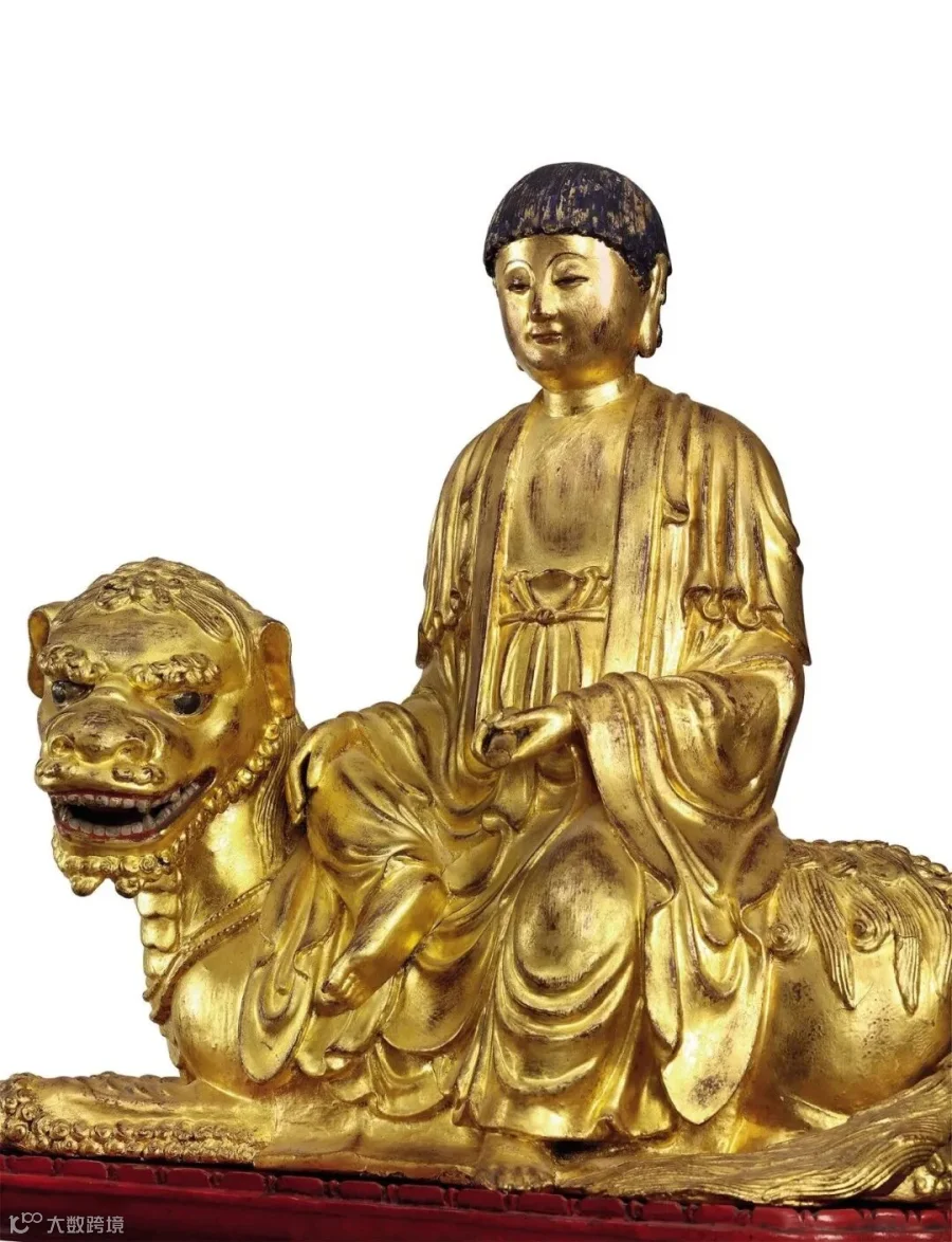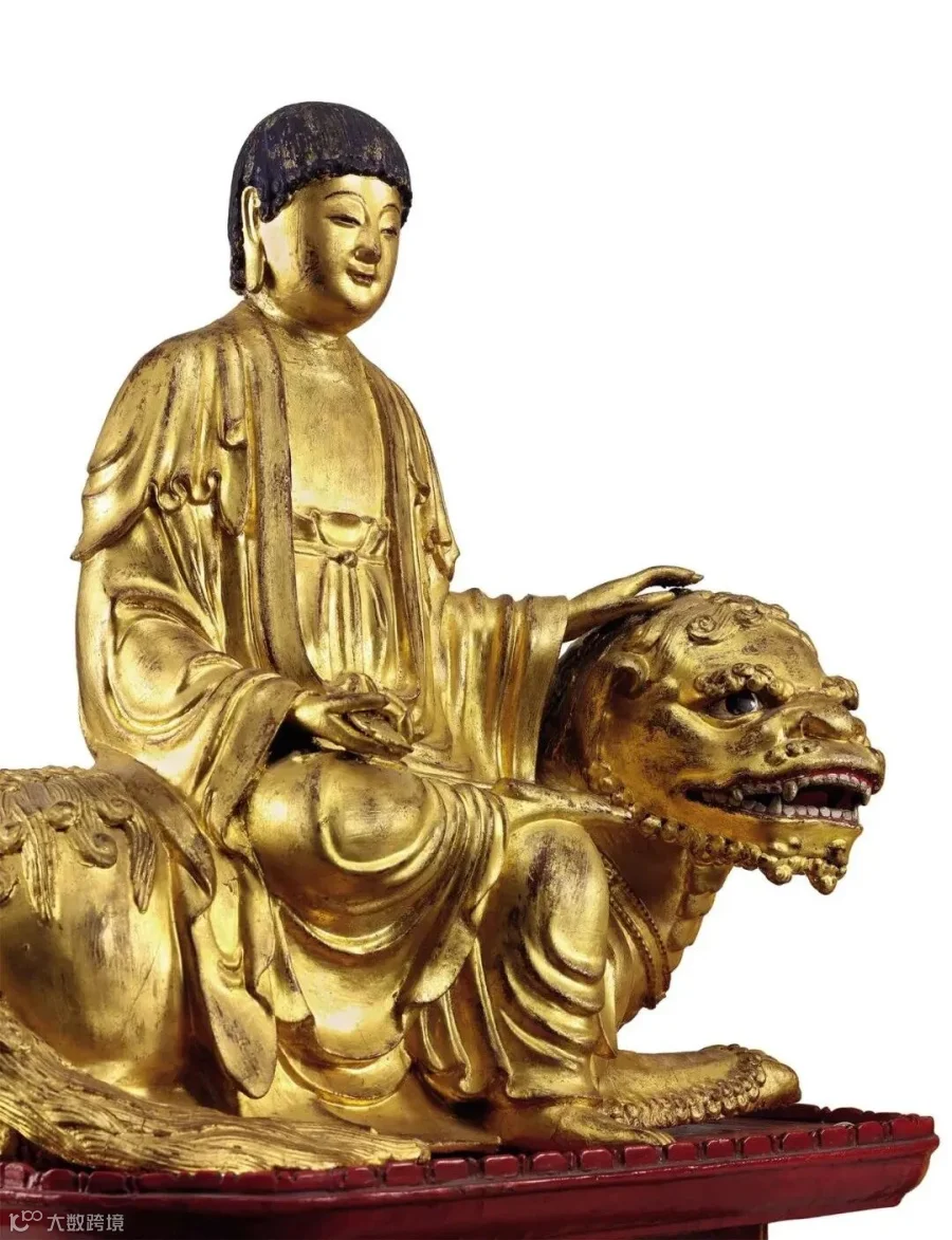此二尊菩萨像采用干漆(生漆)夹纻技术制成,这种工艺流行于现今浙江天台一带,据传由东晋雕塑家戴逵、戴颙父子创造,宋元之际,寺观建造需要大量的造像,铸铜材料入不敷出。另外,沉重的金属造像对建筑结构有特殊要求。元代尼泊尔人阿尼哥和大都艺术家刘元等合作,将金铜造像移植到夹苎造像,如虞集《道园学古录》记载:“漫帛土偶而髹之,已而去其土,髹帛俨然成像。昔人尝为之,至正奉(指刘元)尤极好,抟丸又称脱活,京师人语此。二尊菩萨皆坐于狮子上,菩萨的庄严肃穆与狮子的伟峰林立相映成趣,相得益彰。以此繁复漆艺制成之造像,珍稀罕见。夹纻漆塑制作艰巨,大费周章,制作数量受限,加上干漆纤巧,保存非易,而此二尊造像品相绝佳,气度非凡,更加难能可贵。