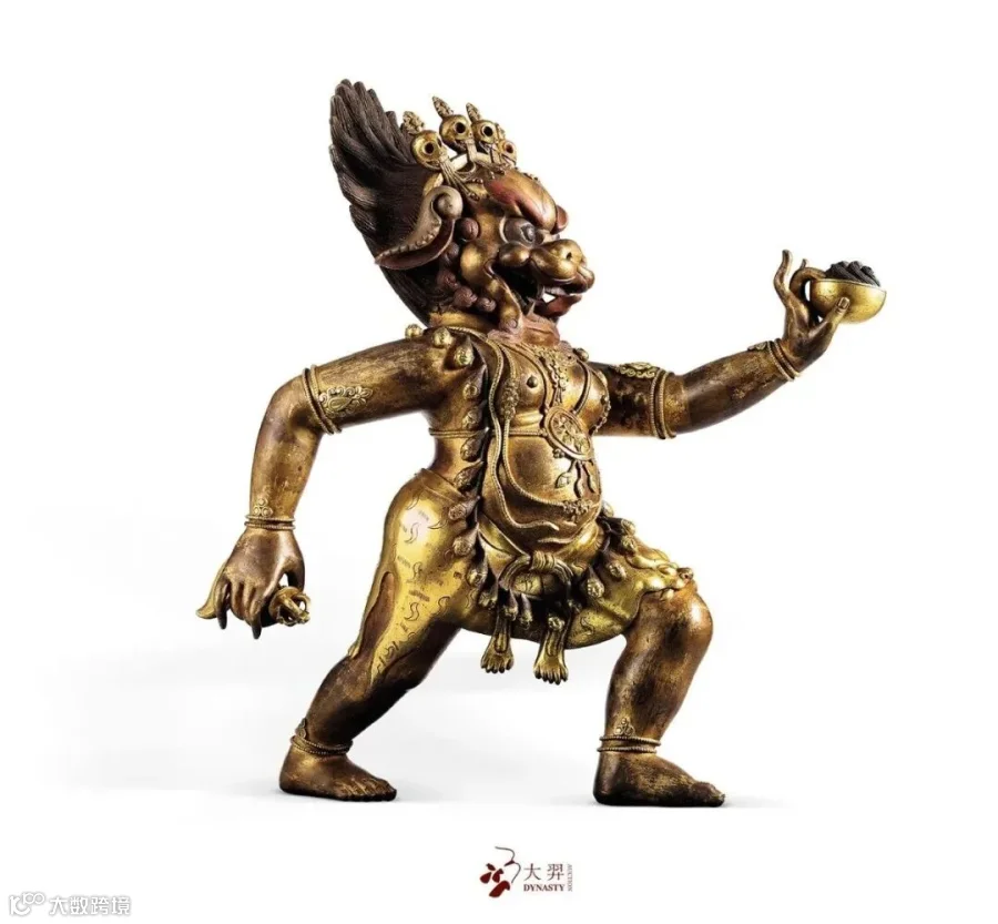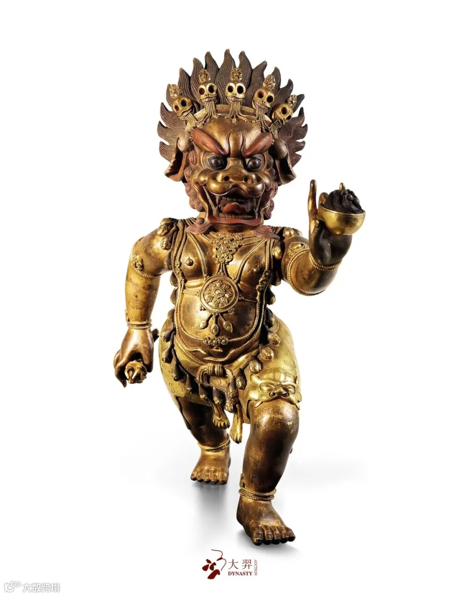 此尊长耳垂肩,红发逆扬,裂嘴獠牙.怒目圆睁,闪舌呲牙,相容凶忿。肢体丰满,右手擎钺刀,左手托嘎巴拉,吞食血肉秽恶,弓姿跨步,栩栩如生。整像体量硕大,工艺细腻考究,肢体极具张力。