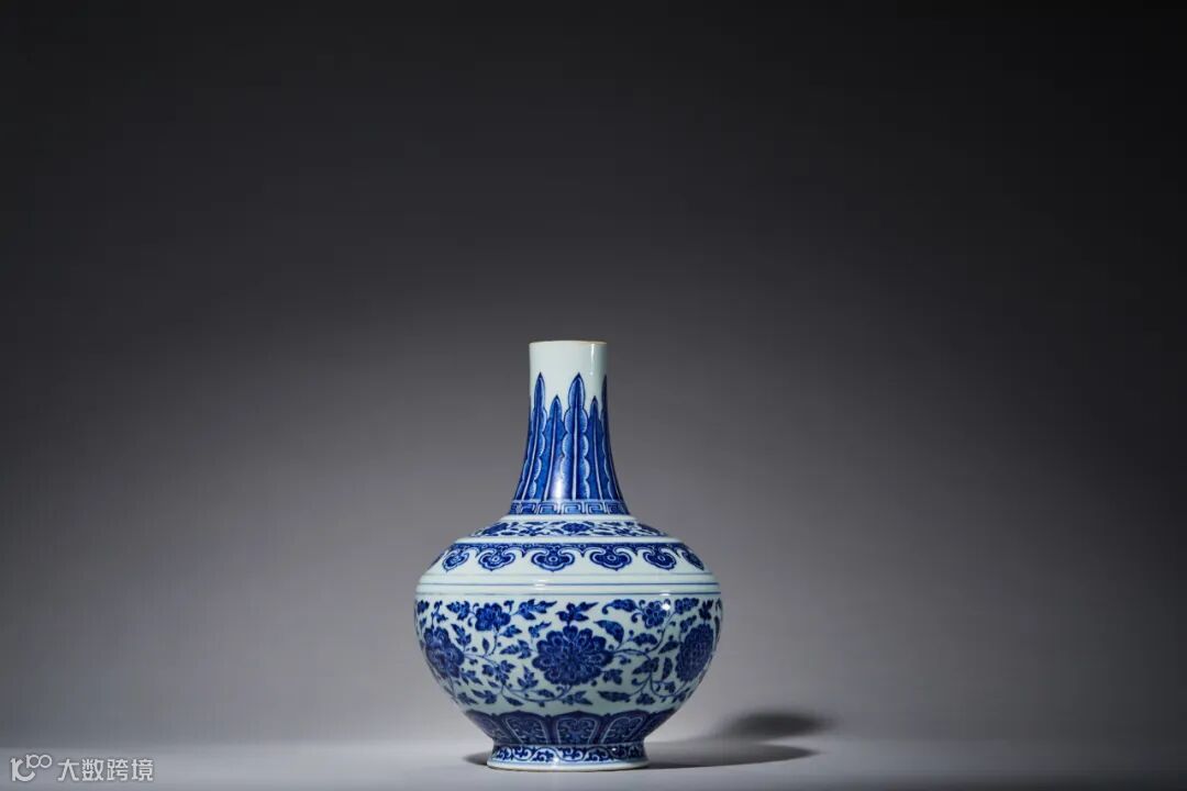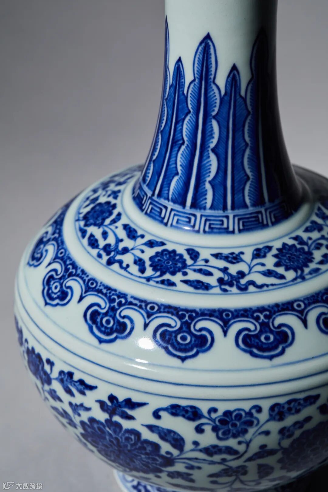 整器青花发色明艳,纹饰繁复华丽,画工点染细腻,层次分明有致。从乾隆时期开始青花赏瓶分为两种,于器形、纹饰上有所不同,一类为仿雍正赏瓶,腹部缠枝莲纹为单层,肩部有三组凸棱,下腹内敛;另一类为腹部缠枝莲纹为双层,肩部无凸棱,腹部浑圆,外足端起唇边。此件拍品即属前者,极为珍贵难得。