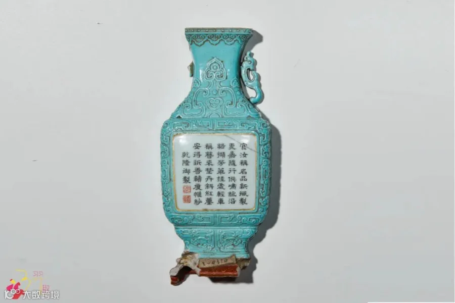 LOT128 清乾隆 松石绿地模印螭龙纹开光墨彩御制诗壁瓶