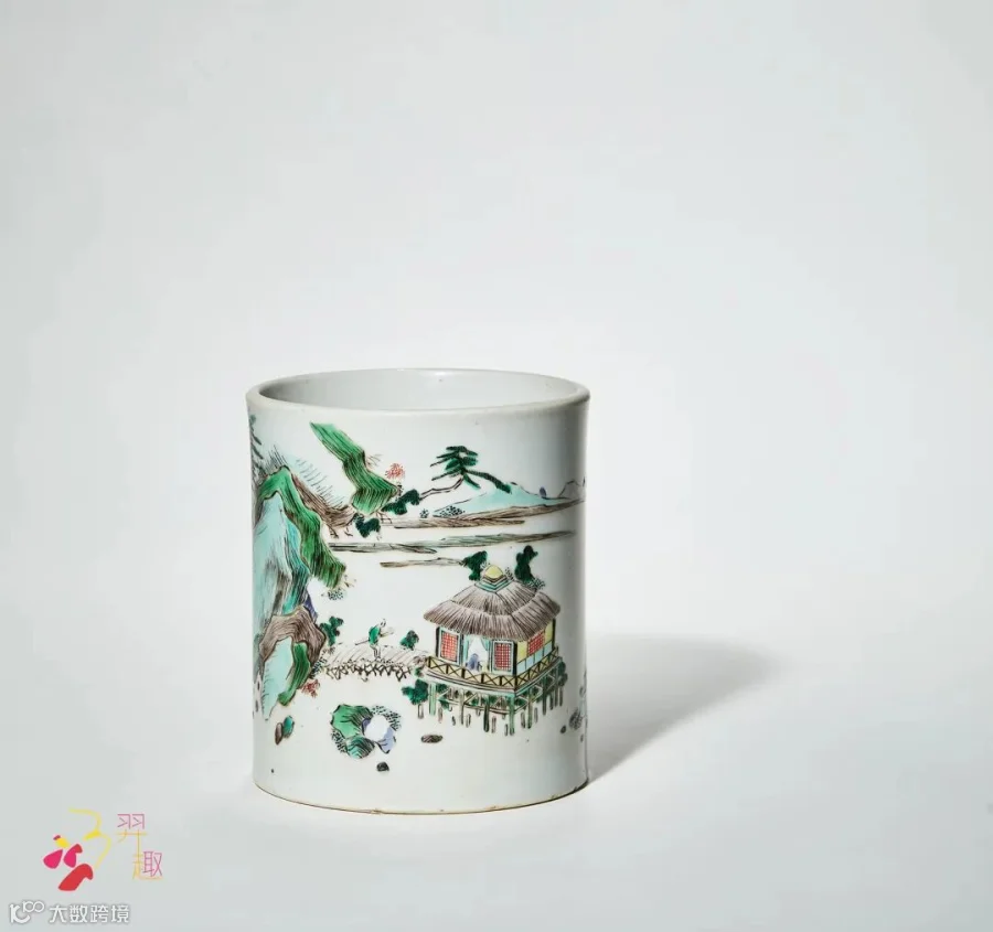 笔筒直腹部,平底。腹部施五彩描绘山水人物纹,远山青翠,近水含波。人家三两,渔樵归晚。小巧器身承载悠远的文人意趣,其上墨书王维诗:“世事浮云何足问,不如高卧且加餐”。其后钤印“木石居”,“木石居”款最早为康熙二十九年,最晚为康熙五十一年,为私家名窑。整器造型典雅,用笔精到,绘画颇具功力,色彩浓淡相宜,可堪赏玩。