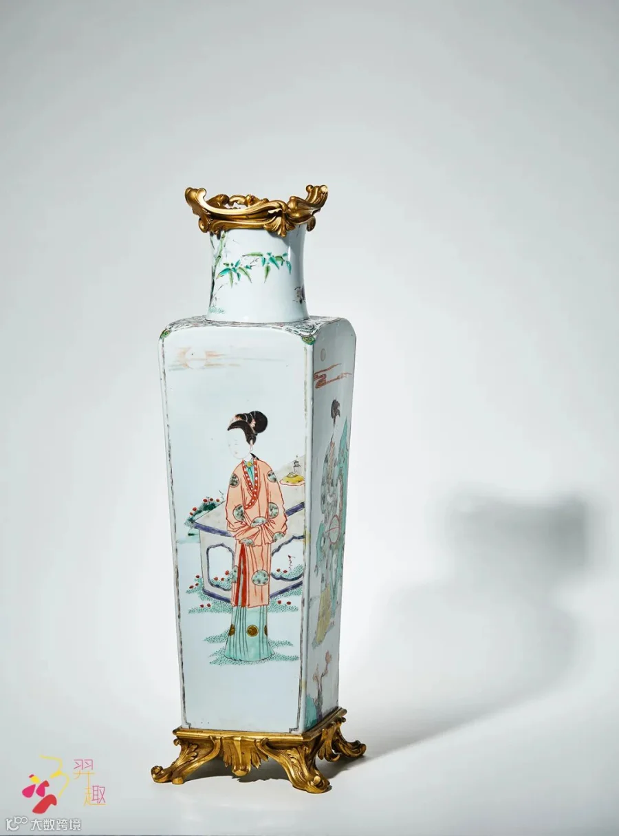 拍品器身高大,上圆下方,取天圆地方天地和谐之意,四方瓶身各方皆有纹饰,以五彩绘仕女为主题纹饰,整器纹饰绘画精细,仕女面容清秀,弯眉笑目,头顶云鬓,身段优雅,端庄清秀,带有女性特有的柔媚,呈现出不一样的风姿清韵。眉眼极其传神,可见艺人笔力之深厚。