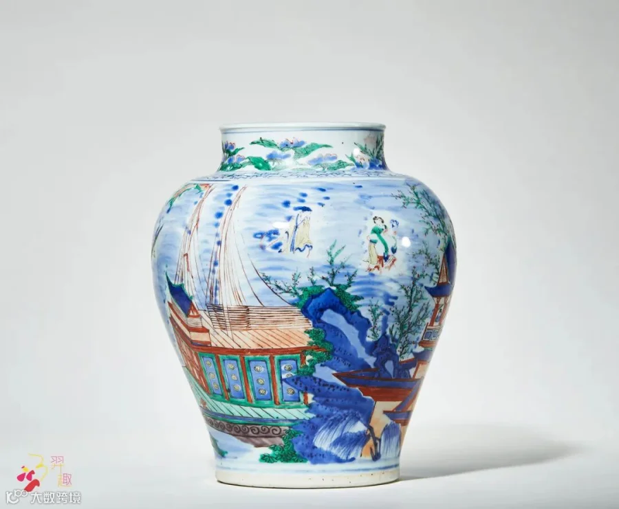 青花五彩“吕洞宾三度城南柳”图罐