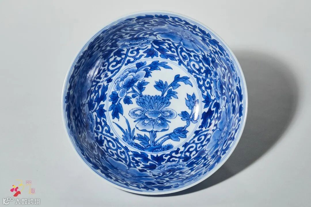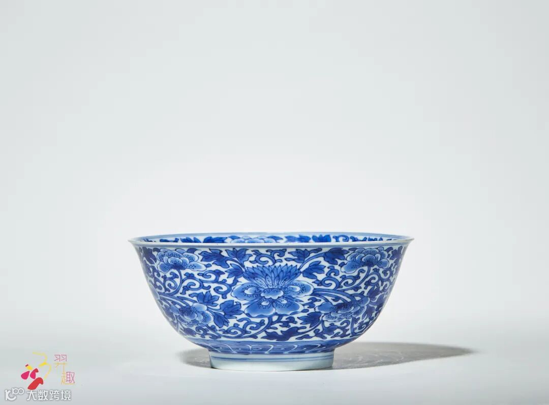拍品撇口,深弧腹,圈足。碗外绘缠枝花卉纹,碗身内外花纹满铺,显得枝繁叶茂,所饰青花发色纯正,且浓淡有致,其装饰方式亦别具一格,显示出当时瓷业的活泼风气。