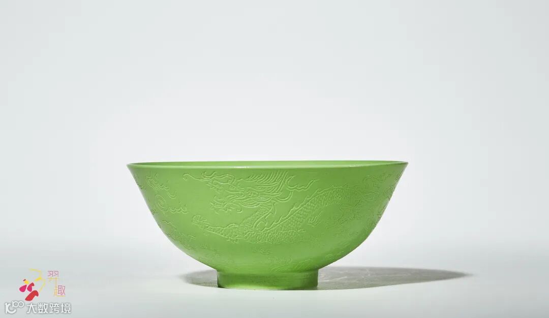 拍品口沿微侈,形制端庄秀雅。碗身施苹果绿釉,釉面均匀润泽,色泽明丽,淡雅清新。外壁暗刻双龙戏珠纹,近足处刻饰海水纹,纹饰布局疏密有致,刻划娴熟精湛。