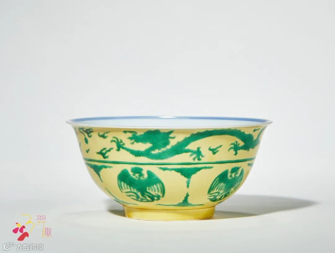 拍品撇口,弧腹,圈足。内外壁均施黄釉,碗身暗刻飞龙团凤纹并填以绿彩,纹饰流畅生动,黄绿二彩色泽娇艳,搭配雅致,为康熙黄地绿彩品种精雅之作。