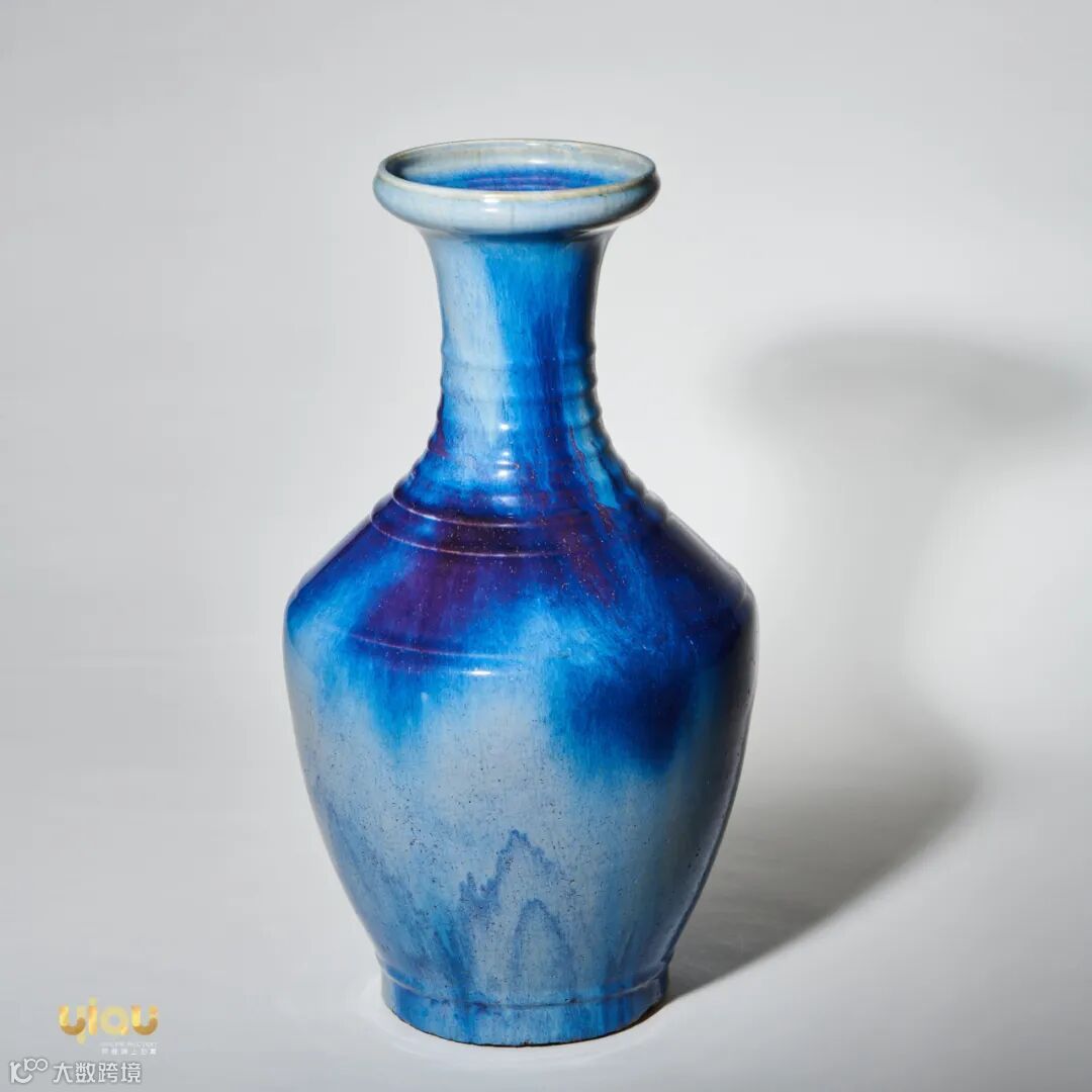 拍品盘口,直颈,溜肩,腹部渐收,圈足,器身饰弦纹数周,亭亭玉立且古雅庄重。通身以紫蓝为基调,釉色酽且正,其间丝丝缕缕向下垂坠,充满流动之感。器腹有“月白色”呈不规则分布,观之令人目眩。口沿处显露胎色,葱青、月白诸色交融流动其间,有“云乱水光浮紫翠,天含山气入青红”的诗意之美。造型优美典雅至极,器身不加雕镂,除器身弦纹外,别无装点,唯以釉色取胜。其窑变釉肥厚润泽,宝光晶莹,呈色异常美妙,青蓝者幽寒如水,艳红者炽烈如火,其交错融流之状,如风动云霞,变换旖旎。