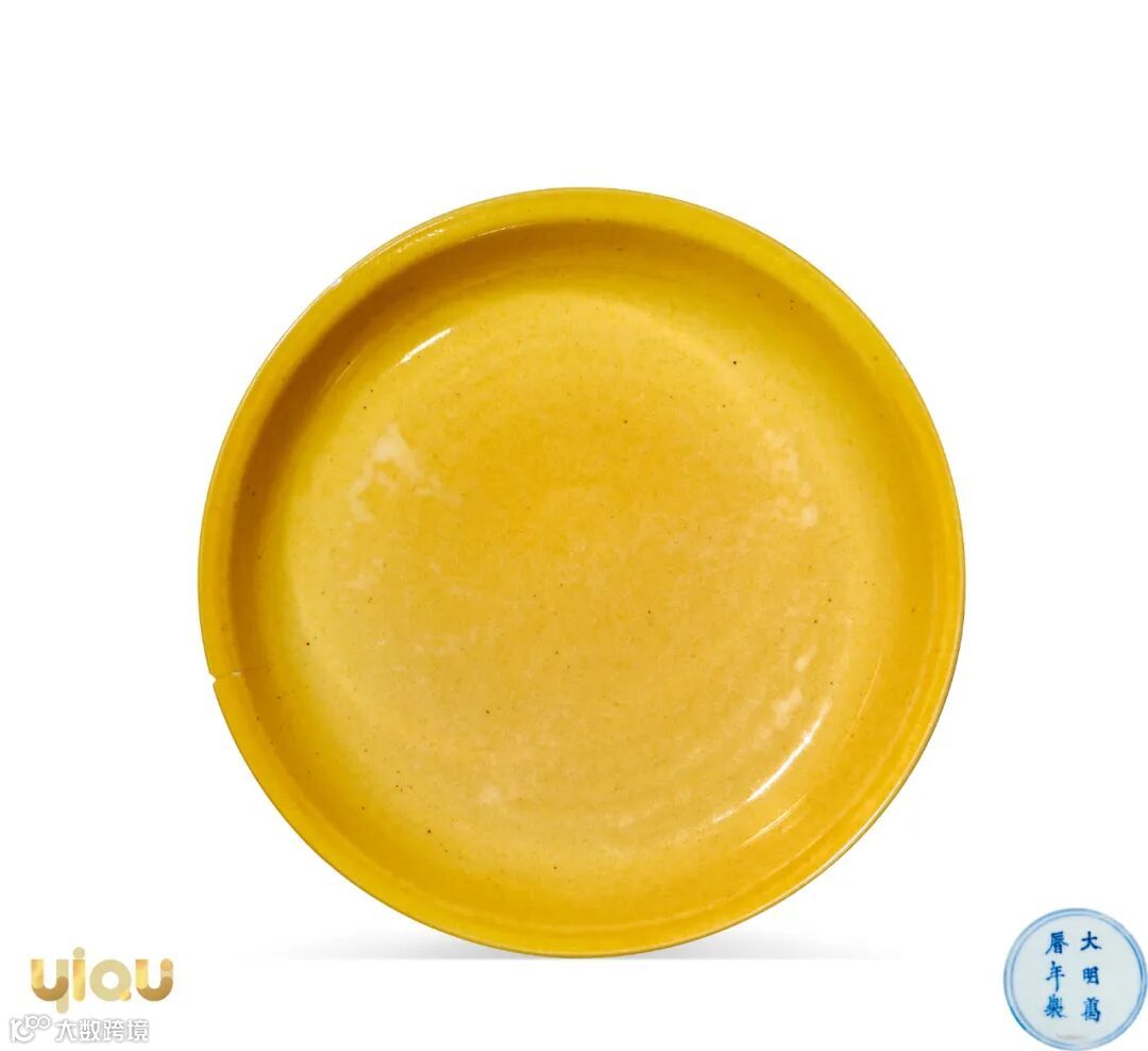 低温黄釉创烧于明初景德镇官窑,以弘治时期制品最为名贵,至万历朝黄釉器烧造渐少,传世器中以碗较多,盘类尤少。拍品撇口,浅弧腹,圈足。盘身施黄釉,釉质莹润,釉层饱满。明代宫廷用瓷等级森严,黄釉是皇家控制最严格的一种釉色,专为帝后日用。万历黄釉直接继承前朝的优良传统,相比之下颜色略深,尤显稳重大气之感。