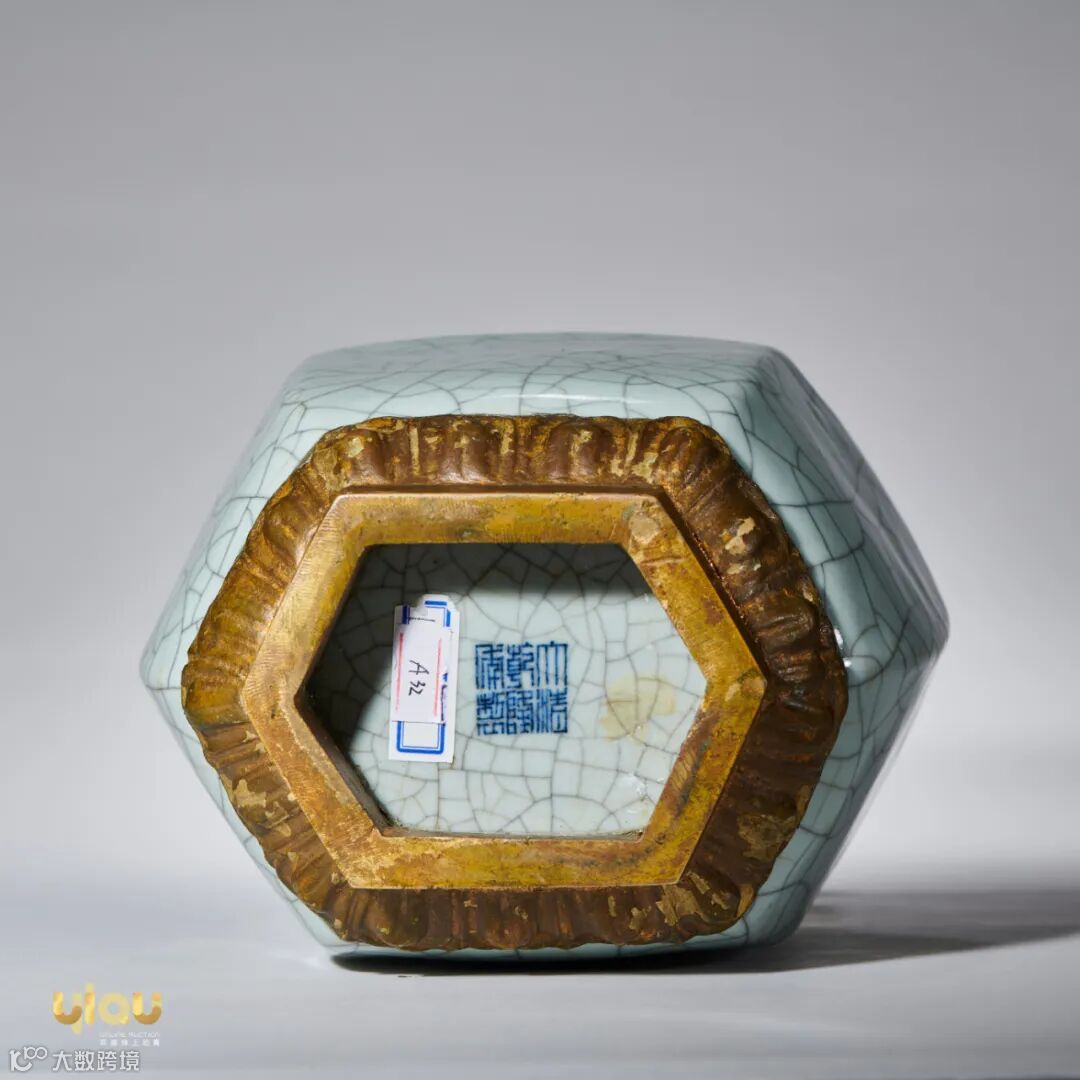 此件拍品即为一件乾隆朝仿哥釉品类瓶,呈六方型,口外撇,收颈并带贯耳,造型大气,器身六道棱角自上而下贯通全器;瓶外壁遍体施仿哥釉,釉色苍青雅致,圈足涂铁锈色。釉色幽隽淡恬,温润似玉,内蕴光华,极见匀净雅靓之致。器底青花书“大清乾隆年制”六字三行篆书款。六方贯耳瓶为清代官窑经典陈设器,始于雍正朝,乾隆慕古,以古为师,陶古铸今,集古今之大成,而仿哥釉色质古雅,为宋器之精粹,备受弘历喜爱。