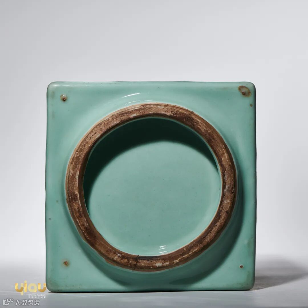 器身整体呈四方形,圆口,圈足。通体施以青釉,器身堆塑弦纹作为主要装饰。琮式瓶的造型源自新石器时代晚期良渚的玉琮,宋代官窑和龙泉窑对其进行仿制,创制出了瓷器的琮式瓶的造型,古雅素丽,清代慕古仿古之风盛行,仿宋瓷器多有烧造,拍品器形、釉色均刻意仿宋,时代特征清晰。