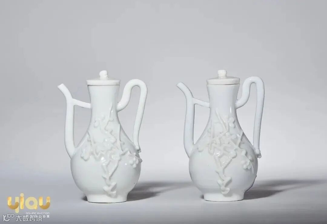 德化窑白瓷历史悠久,产品制作精细,胎质优异,质地坚密,晶莹如玉,德化器型以佛像雕塑、杯、壶、炉等为主,本品即为一对执壶。外壁一面凸塑一枝梅干,上开梅花朵朵,通体施白釉,釉面润泽,带原配盖子,成对保存更是难得。