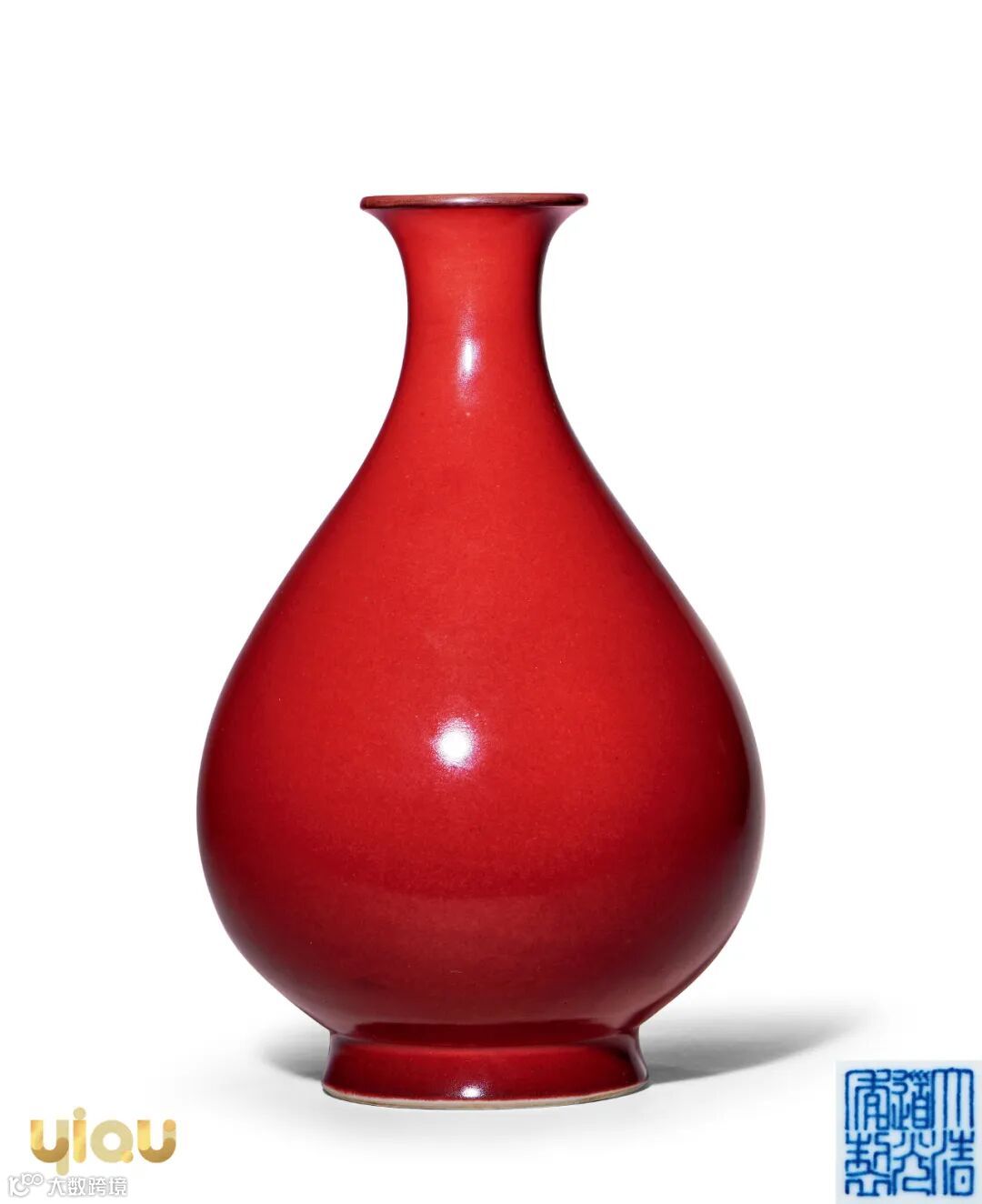 本品侈口,束颈,溜肩,圆弧腹略垂,及底内收,下承圈足,足墙微外撇,胎体细腻紧致,造型周正俊秀,外形线条流畅。外壁通施红釉,发色纯净,均匀光滑,鲜红欲滴,似血如霞,娇艳动人。外底心以青花书“大清道光年制”六字三行篆书款。