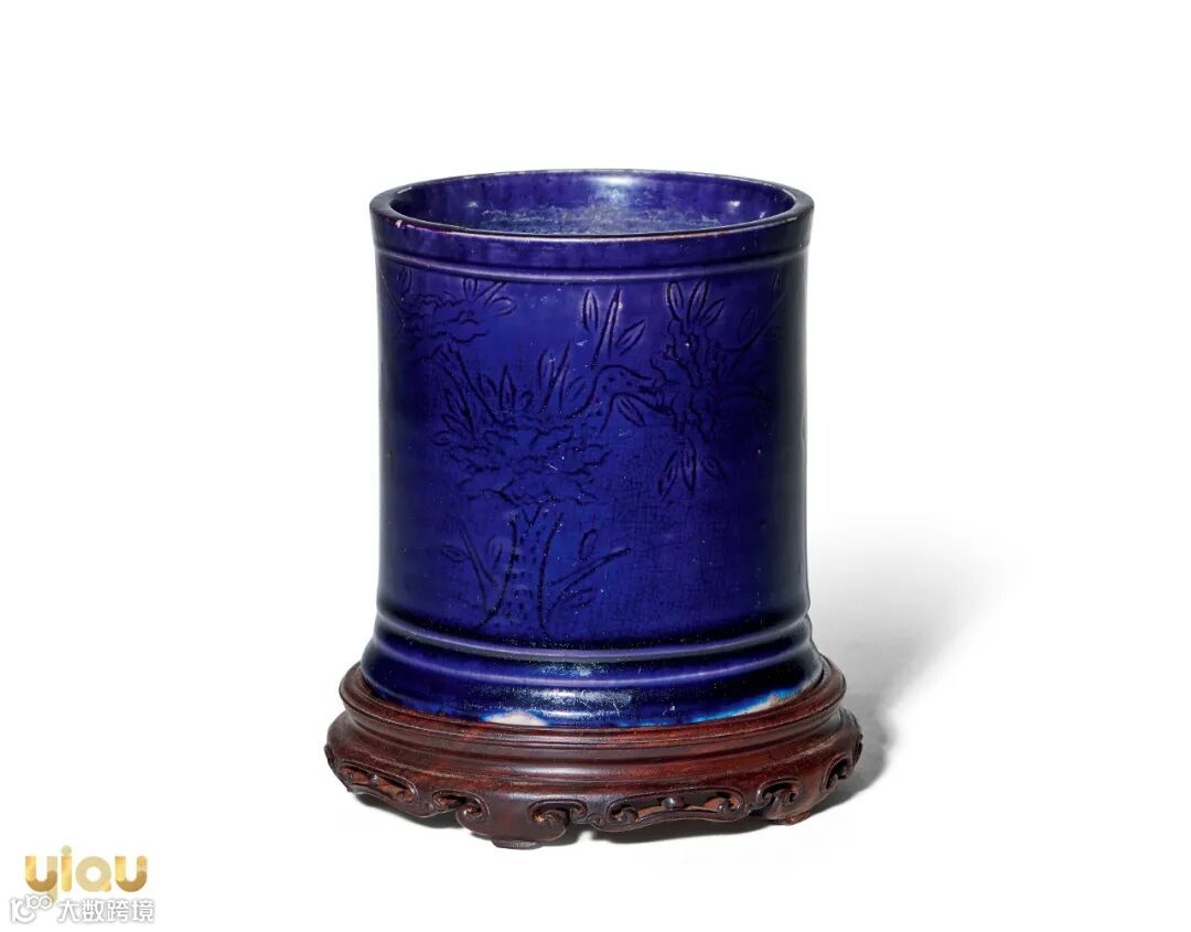 茄皮紫釉创烧于明代中期,清康熙时期甚为流行。茄皮紫系以锰为着色剂,在850度左右火候窑温中烧成。其色紫中泛蓝,釉质肥厚光润,釉色有深浅两种,深者呈紫黑,浅者呈淡紫,以无裂纹者为上乘。茄皮紫釉烧制于弘治时期,嘉靖、万历时虽然都有茄皮紫釉品种,但造型不及弘治时规整。真正形成较为纯正美丽的色泽则要至康雍年间。拍品造型富于变化,简约雅致,胎质细腻,釉面匀润,暗刻花卉纹饰富于艺术性。此品种比较少见,属于文房雅赏。