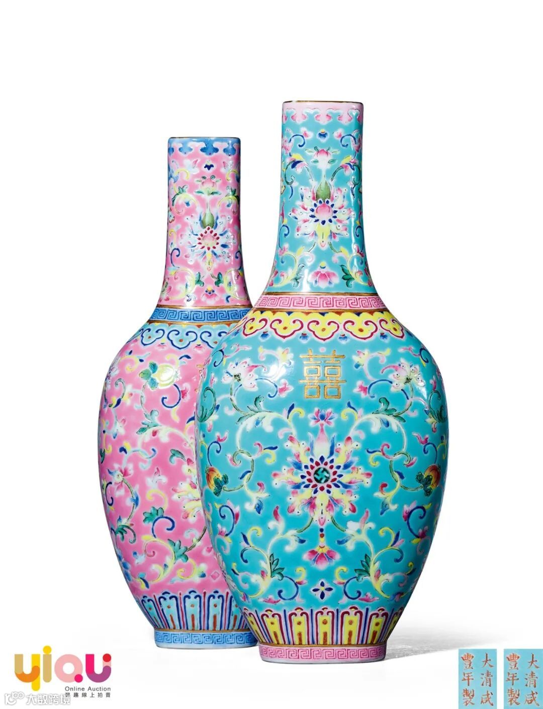 2020年时,晚清瓷器板块整体价格一路上涨,2021年市场行情更为活跃。2020年羿趣首拍中曾释出过一对青花缠枝莲纹玉堂春瓶,在当时创造了晚清青花玉堂春瓶的价格记录,分别以 38万元和49.5万元成交。北京大羿2020春拍也曾释出一只Lot 23清宣统粉彩洪福齐天纹玉堂春瓶,以43.7万元成交,后又于2021年羿趣春拍再次释出,突破自身记录以632,500元成交。