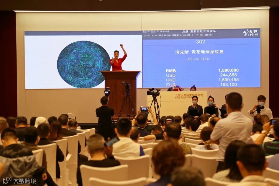 再者三只大盘的品相皆基本良好,因此这三件拍品刚开始举槌,就引起激烈的叫价,每位竞价者都抱着势在必得的决心,报价直线上升。以25万元起拍,最终皆破百成交,溢价4倍,成交价分别为:LOT301 清光绪黄地青花九桃纹大盘2,415,000元;LOT302清光绪青花地绿龙纹盘1,725,000元;LOT303清光绪矾红彩九龙纹大盘2,645,000元,把火热的现场气氛又一次推上高潮。
