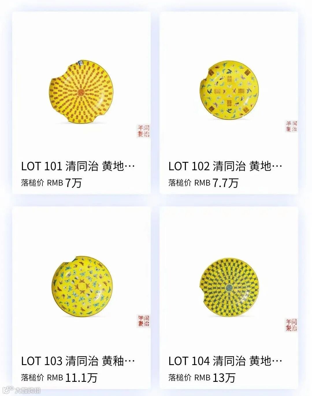 同场拍卖会的“北京工艺美术”专场中,有四件同治大婚瓷器,纹饰为“喜”、“寿”、“蝶”。即使器身有瑕,仍被线上以及现场藏友们激烈竞争,均溢价逾10倍卖出。分别以LOT101 清同治 黄地红彩喜字纹盘 以80,500元成交;LOT102 清同治 黄地粉彩百蝶喜字纹盘以88,550元成交;LOT103 清同治 黄釉粉彩百蝶纹盘以127,650元成交;LOT104 清同治 黄地蓝彩百寿纹盘以149,500元成交。