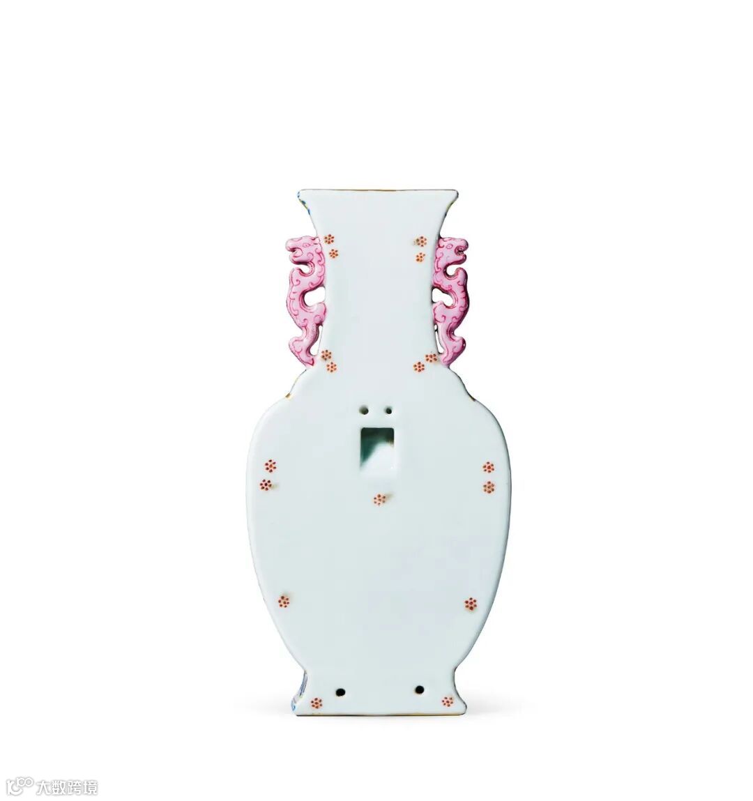 壁瓶悬于墙壁,为半器造型,始见于宣德时期,直到万历开始流行,乾隆朝达到制器巅峰,此时壁瓶造型规整且多种多样,曾将十四式壁瓶挂饰在养心殿三希堂的东板墙上,《清高宗御制诗文全集》有七首咏『挂瓶』的诗,反复吟咏,可见其珍爱程度。乾隆四十五年八月十七日九江关监督额尔登布于《贡档进单》中记载:『(奴才)額爾登布跪進:……(交熱河)白地洋彩花卉轎瓶成對,……』。或为拍品同类器之九江关御瓷进贡记录。