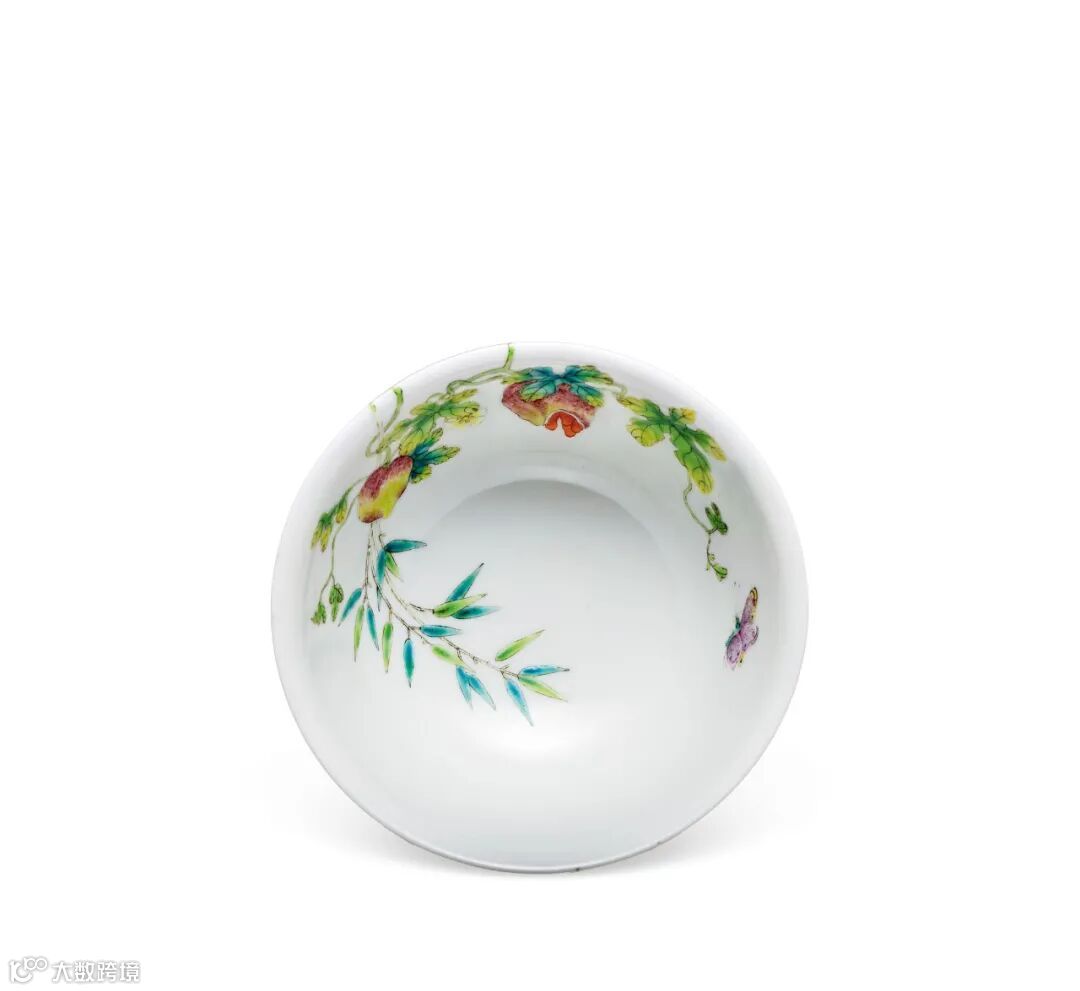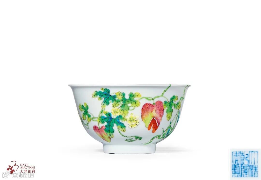 说明:本品端正秀美,敞口微撇,弧腹下收,下承圈足。器身满施白釉为地,其上以粉彩绘过枝癞瓜图,其间数朵清雅黄花,癞瓜饱满开裂,瓜瓤垂而外流,蝶舞翩翩,相伴其中,更添灵动。翠竹、瓜蔓以青绿两色绘就,以示阴阳反侧,竹枝纤长挺拔,瓜藤缠绕婉转,由碗外壁攀爬过枝延伸至碗内,设计构思巧妙精致,器底落『大清乾隆年制』六字篆书款。癞瓜又称癞葡萄,其籽多而饱满,有瓜瓞绵绵、富贵多子之美好寓意,清代常作为吉祥纹饰使用。民国许之衡于《饮流斋说瓷》中赞其:『过枝花杯、碗雅称隽品,至道光时,盛行过枝癞瓜及过枝葡萄,癞瓜牵藤,间夹翠竹,繁丽中殊有玲珑剔透之致,较胜于寻常绘花卉者。』