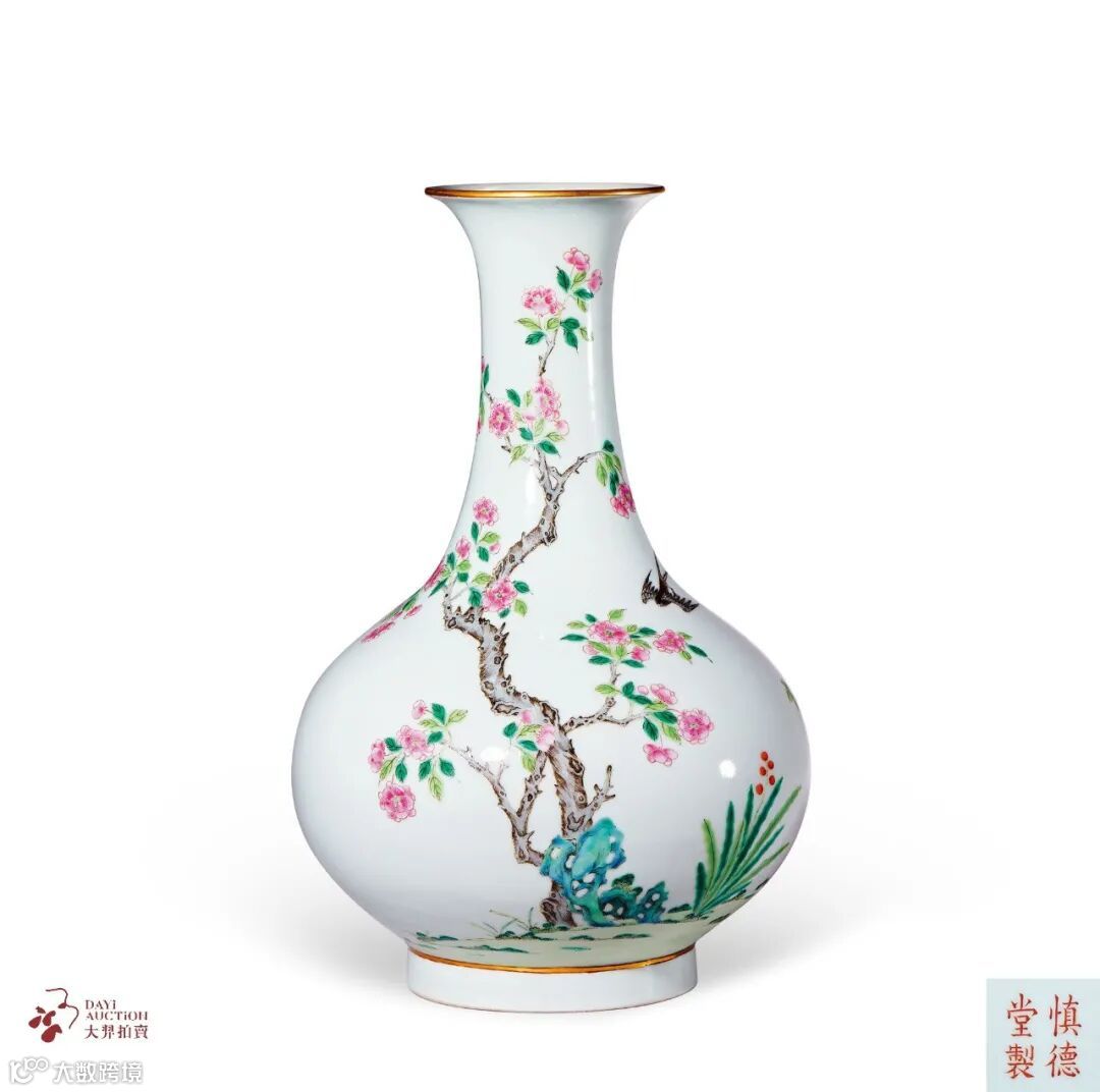署“慎德堂”款瓷器是道光时期的一个官窑品种,为景德镇御窑)‘特意为道光帝烧制的堂名款瓷器。慎德堂为圆明园内九洲清晏的一组建筑,建于道光十年,是道光皇帝的行宫,其长期于此居住并处理朝政。陈浏《陶雅》称“慎德堂为道光窑中无上上品,足以媲美雍正。质地之白,彩画之精正在伯仲间。”这一特点在本件拍品上体现得尤为显著。此瓶彩绘妍美,无论是彩料,还是纹样布局,皆摹雍正御瓷之风,堪当宝藏。