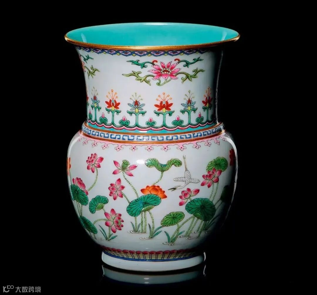 说明:拍品体量颇为精巧,可爱隽秀,十分罕见。小尊喇叭状口,鼓腹渐敛,下承小圈足,足内施松石绿釉,中央留白,署矾红彩『大清乾隆年制』六字三行篆书双框款,款识形式新颖少见。器内壁满施松石绿釉。腹壁莹洁的白釉地上以粉彩描绘通景的荷塘白鹭图。池水中,嫩绿的叶柄、花梗从水中升起,托起硕大的荷叶、鲜艳欲滴的荷花与饱满多子的莲蓬,摇曳生姿。其间点缀四只形态各异的白鹭,羽翼丰满而洁白,姿态悠然自得,轻逸出尘。整幅画面,呈现出一派自然恬静的夏日荷塘美景。主题纹饰外,自上而下辅以如意云头纹、折枝莲纹、缠枝莲纹、变形夔纹、莲瓣纹等,施彩丰富而不繁缛,色泽丰富娇艳而不媚俗。口沿、颈肩部加饰三道金彩,熠熠生辉。