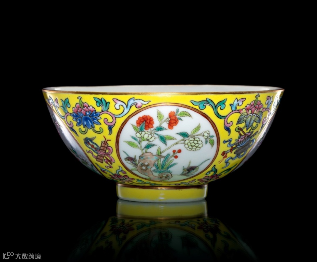 清道光 黄地粉彩描金开光花卉暗八仙纹碗(故宫博物院藏)
