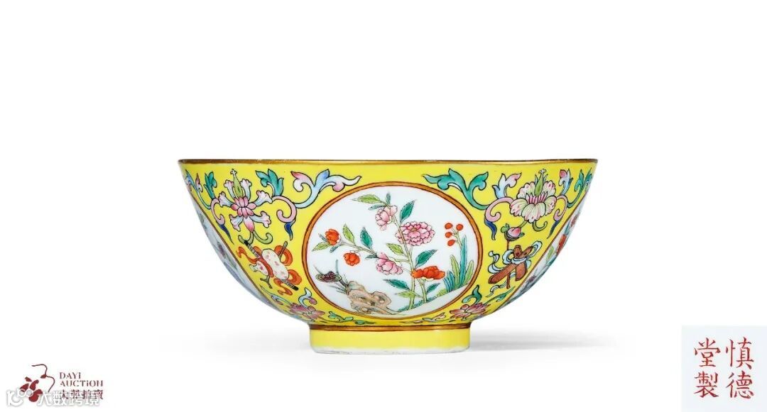 说明:小碗造型典雅周正,撇口弧腹,下承圈足,小器大样,把手可玩。外壁以柠檬黄彩为地,四处圆形描金开光,内以粉彩绘灵芝、水仙、天竺等洞石花卉,有灵仙祝寿、玉堂富贵之祥瑞寓意,开光外绘缠枝宝相花及西番莲纹样,间饰暗八仙图案。圈足内以矾红彩书“慎德堂制”四双行楷书款。此器工艺考究卓著,施彩绚丽富贵,装饰华美非凡,为清代道光官窑上乘至精之作。