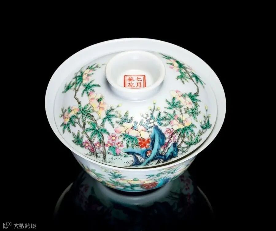 拍品为乾隆朝粉彩茶器之珍贵隽品,精巧别致,碗敞口,深弧腹,拱形盖顶设圆钮,扣合于茶盅之内。瓷胎细密,白釉莹润通透,碗身及盖面皆以粉彩绘七月葵花洞石图,黄蜀葵娇艳盛开,圃簇似锦,大花黄粉相间,小朵粉丽柔嫩,含苞欲放,竞相争艳,摇曳生姿。洞石旁红叶依附,点睛夺目,一派春光明媚之景。