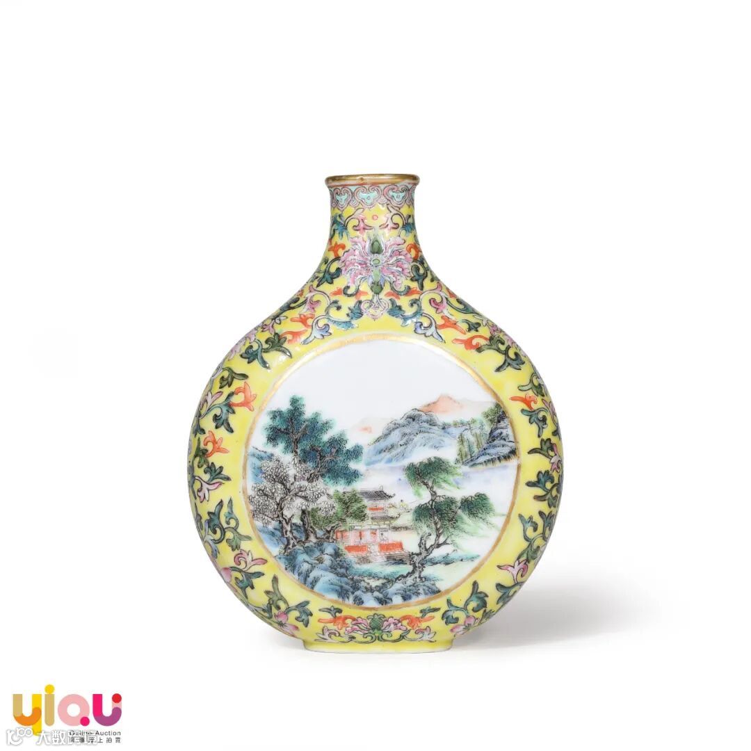 黄地粉彩缠枝莲开光山水人物纹扁壶