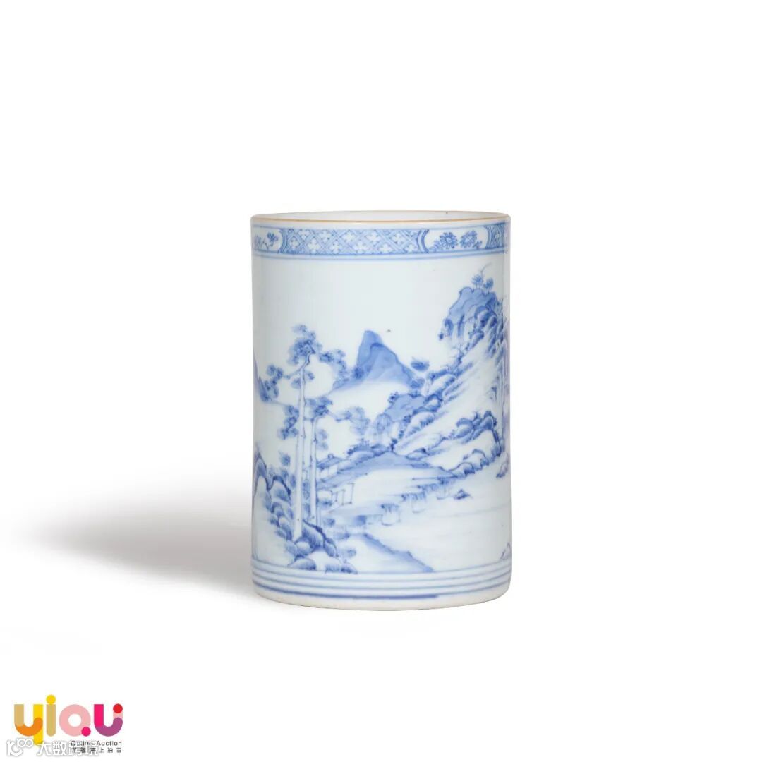 青花山水人物图笔筒