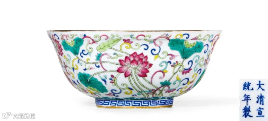 LOT823 清宣统 内青花外粉彩荷塘花卉纹碗