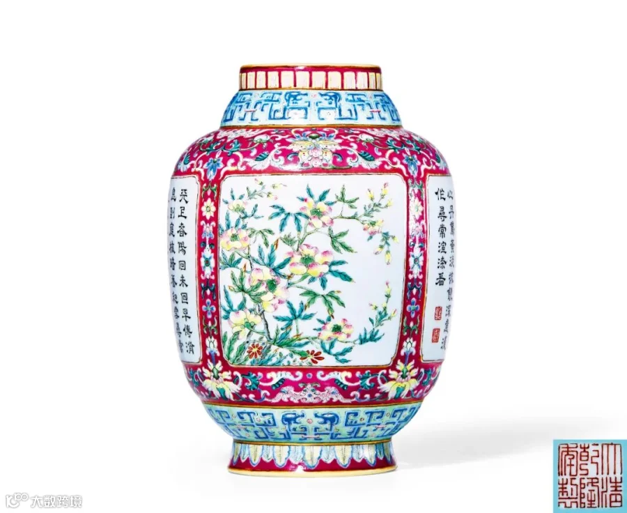 LOT856 清乾隆 胭脂红地粉彩开光花卉御题诗文瓶